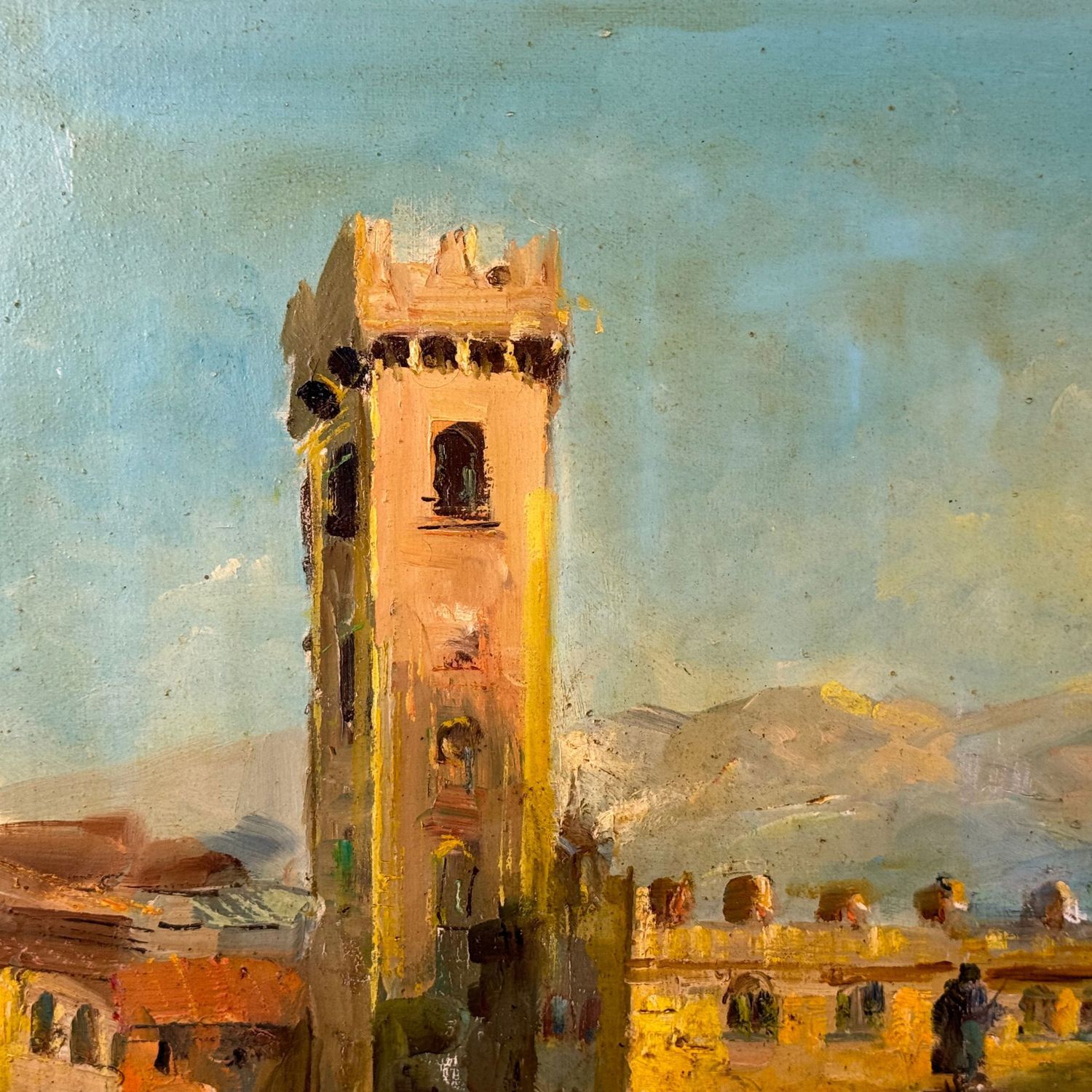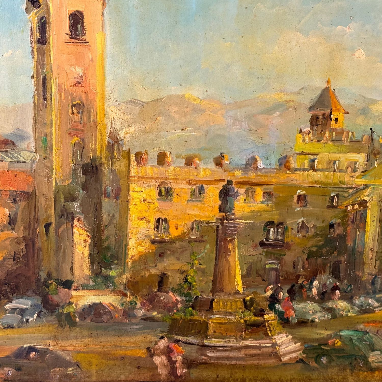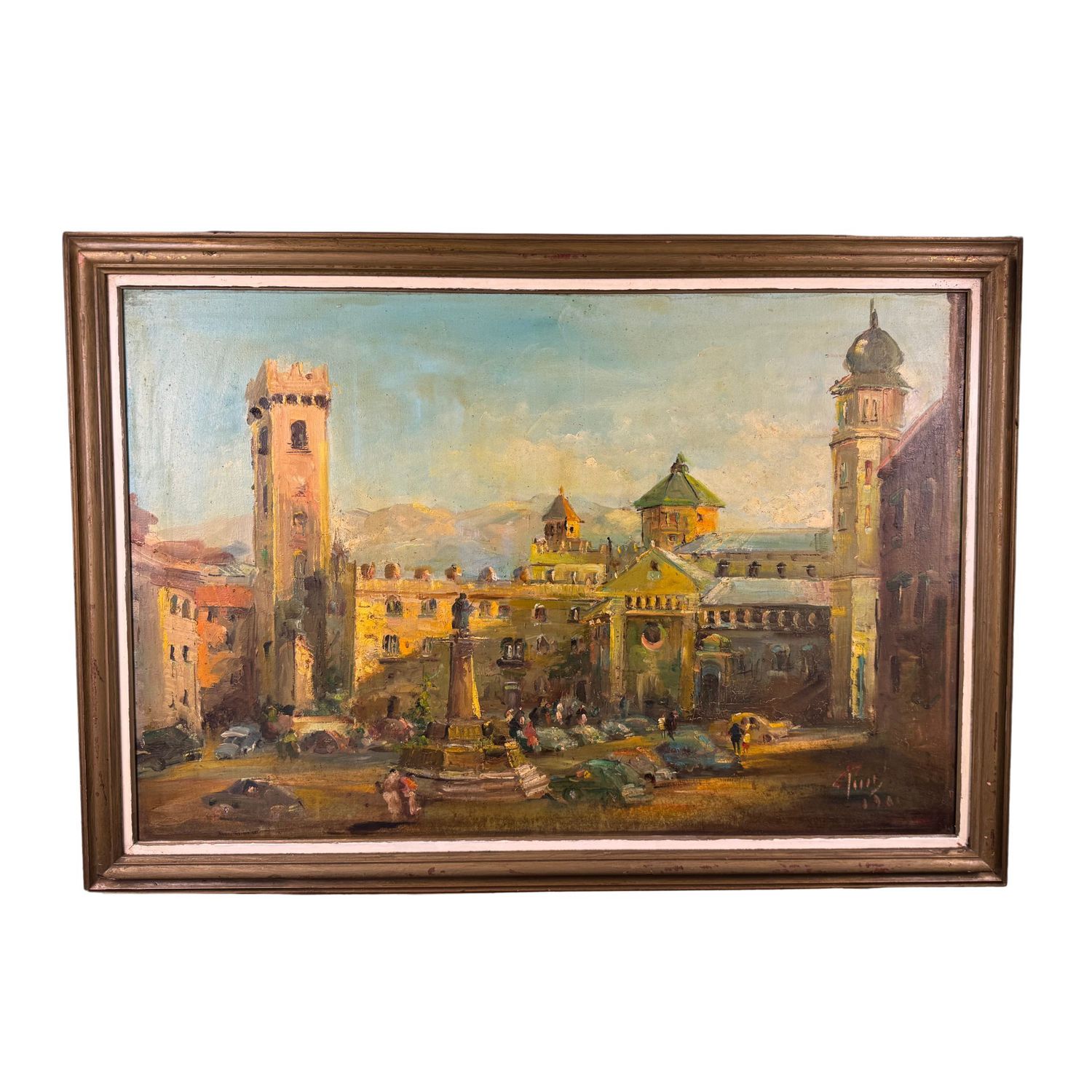 Dipinto olio su tela, periodo XX secolo (1900 - 1910) scuola Italiana, raffigurante Piazza del Duomo di Trento. Dimensioni interno cornice: 95x64 cm. Dimensioni compreso cornice: 104x73 cm. Firmato in basso a destra da artista non identificato. Opera in buone condizioni.