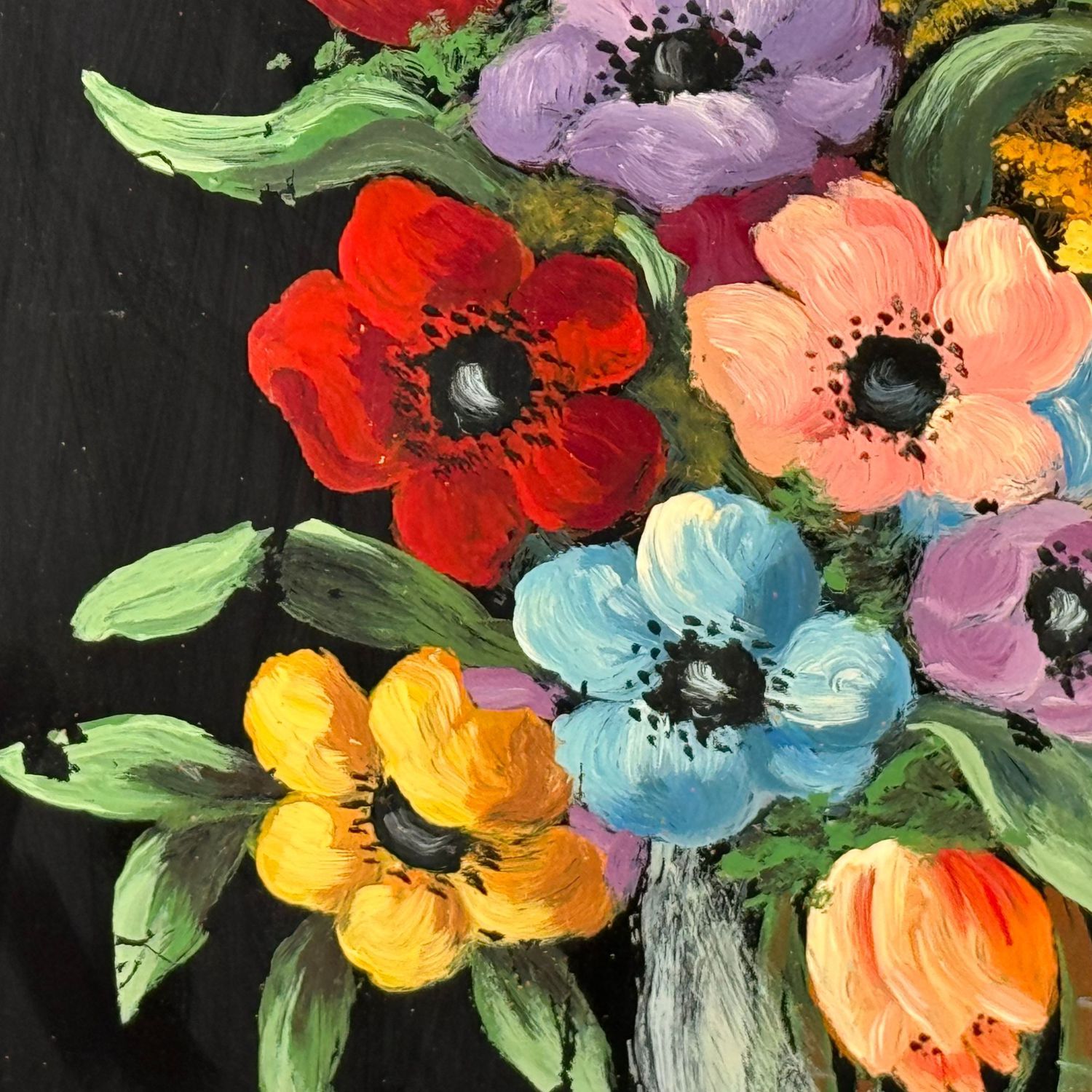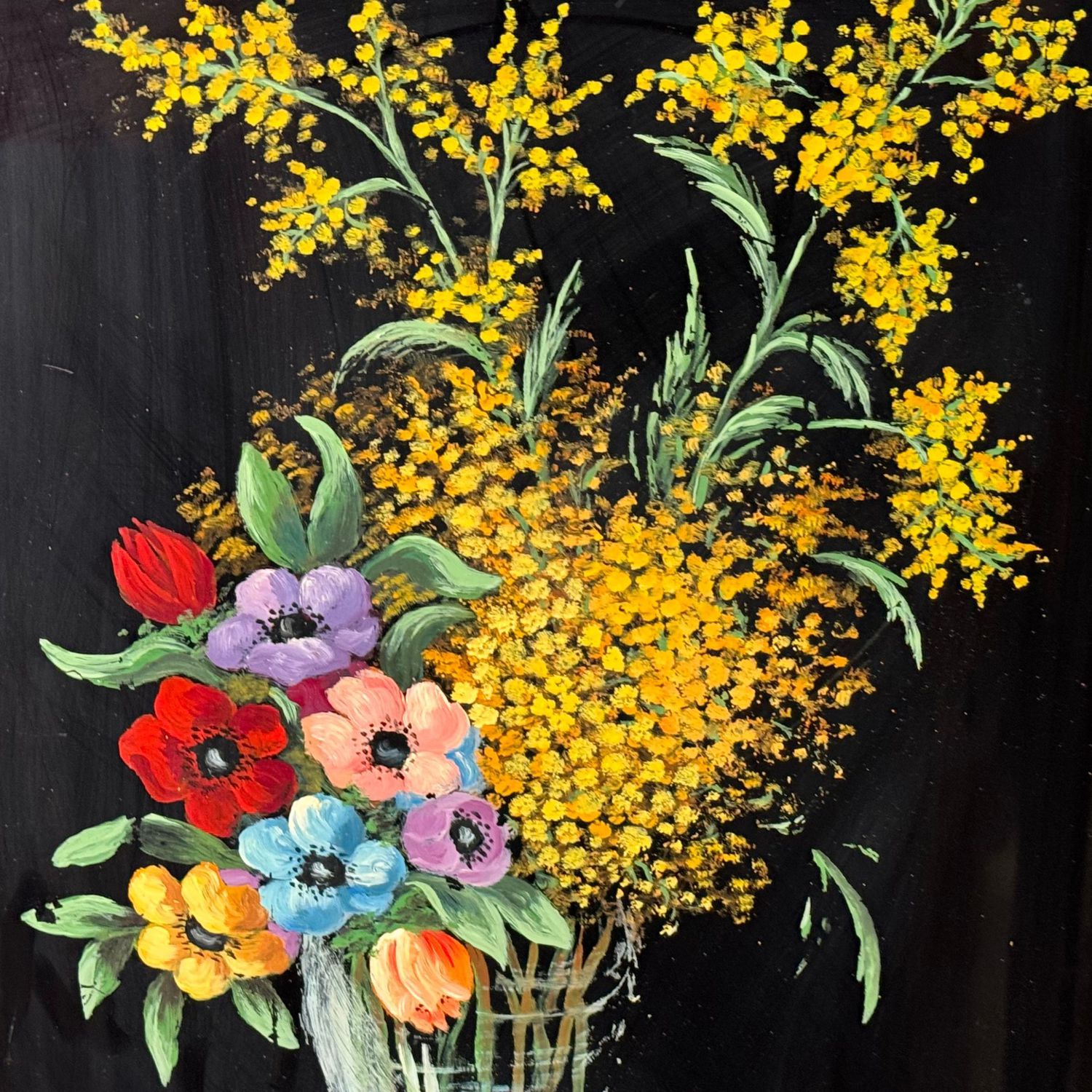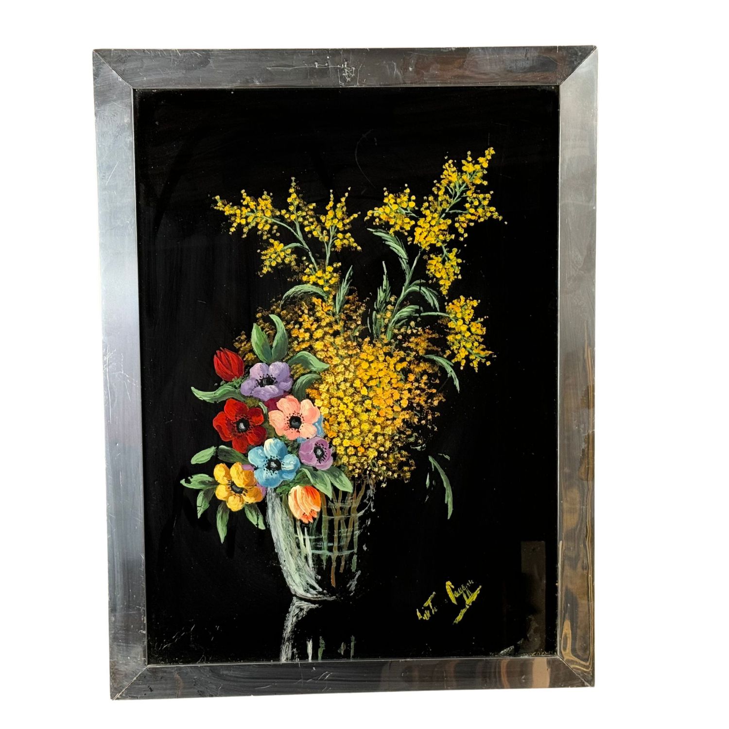 Acrilico su vetro, periodo XX secolo scuola italiana, raffigurante Composizione di fiori. Dimensioni interno cornice: 39x53 cm. Dimensioni compreso cornice: 46x60 cm. Reca firma in basso a destra da artista non identificato. Opera in buone condizioni.