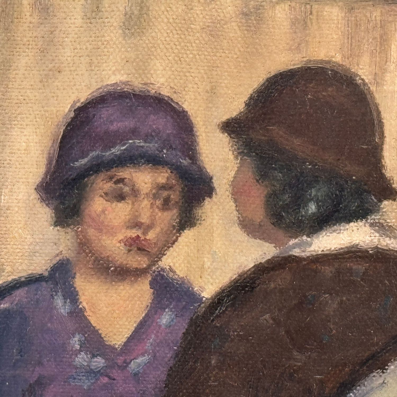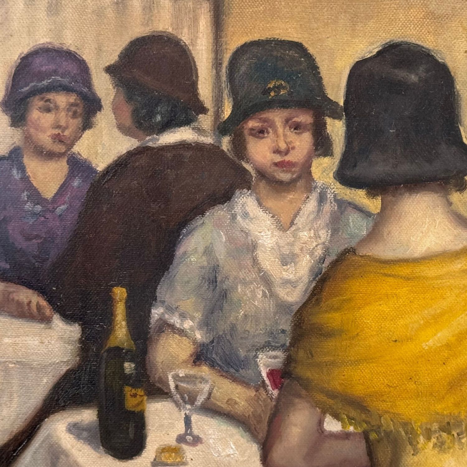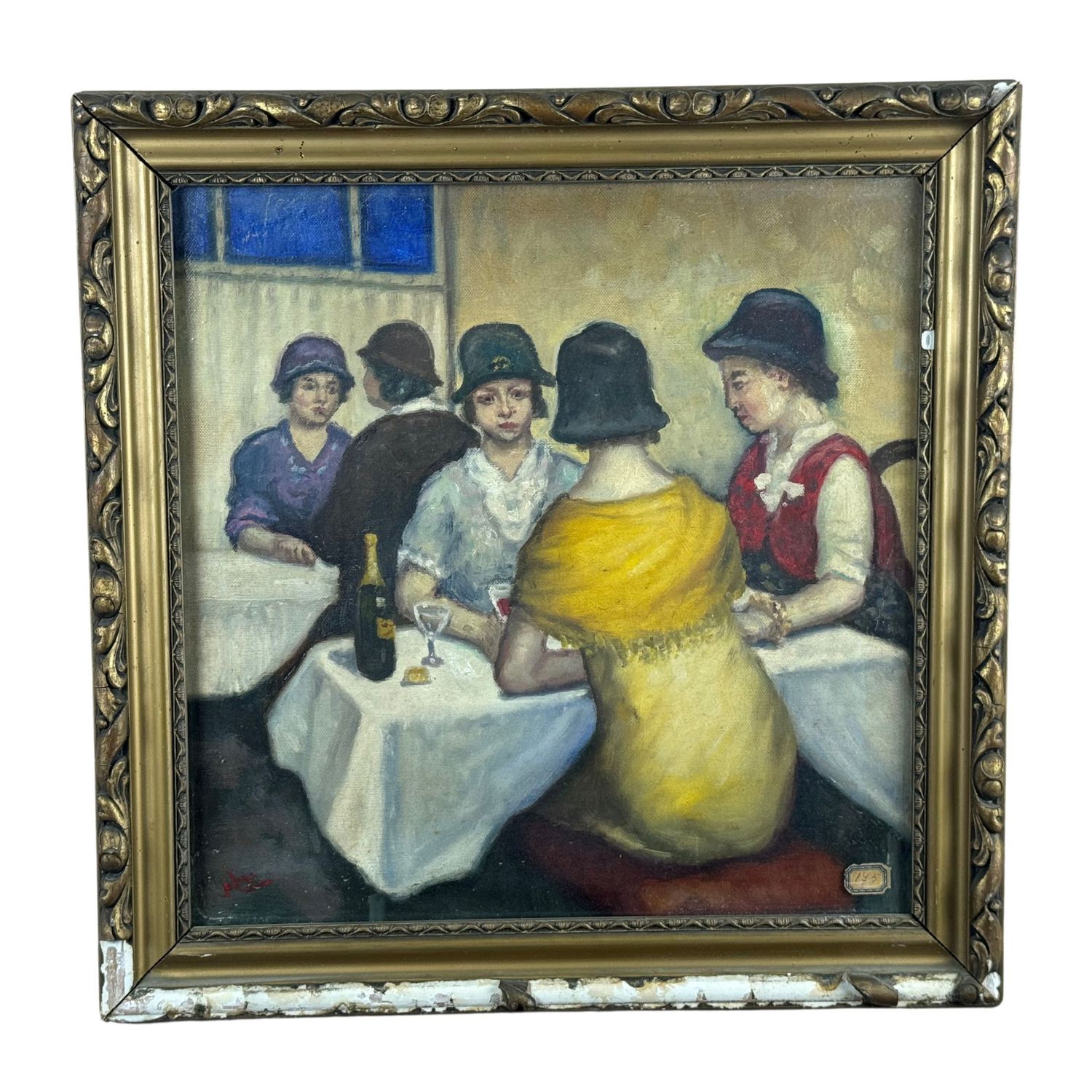 Dipinto olio su tela, periodo XX secolo, scuola Europea, raffigurante Incontro tra amiche al bar. Dimensioni interno cornice: 40x40 cm. Dimensioni compreso cornice: 48x48 cm. Reca firma in basso a sinistra di difficile lettura. Opera in buone condizioni. Cornice da restaurare.