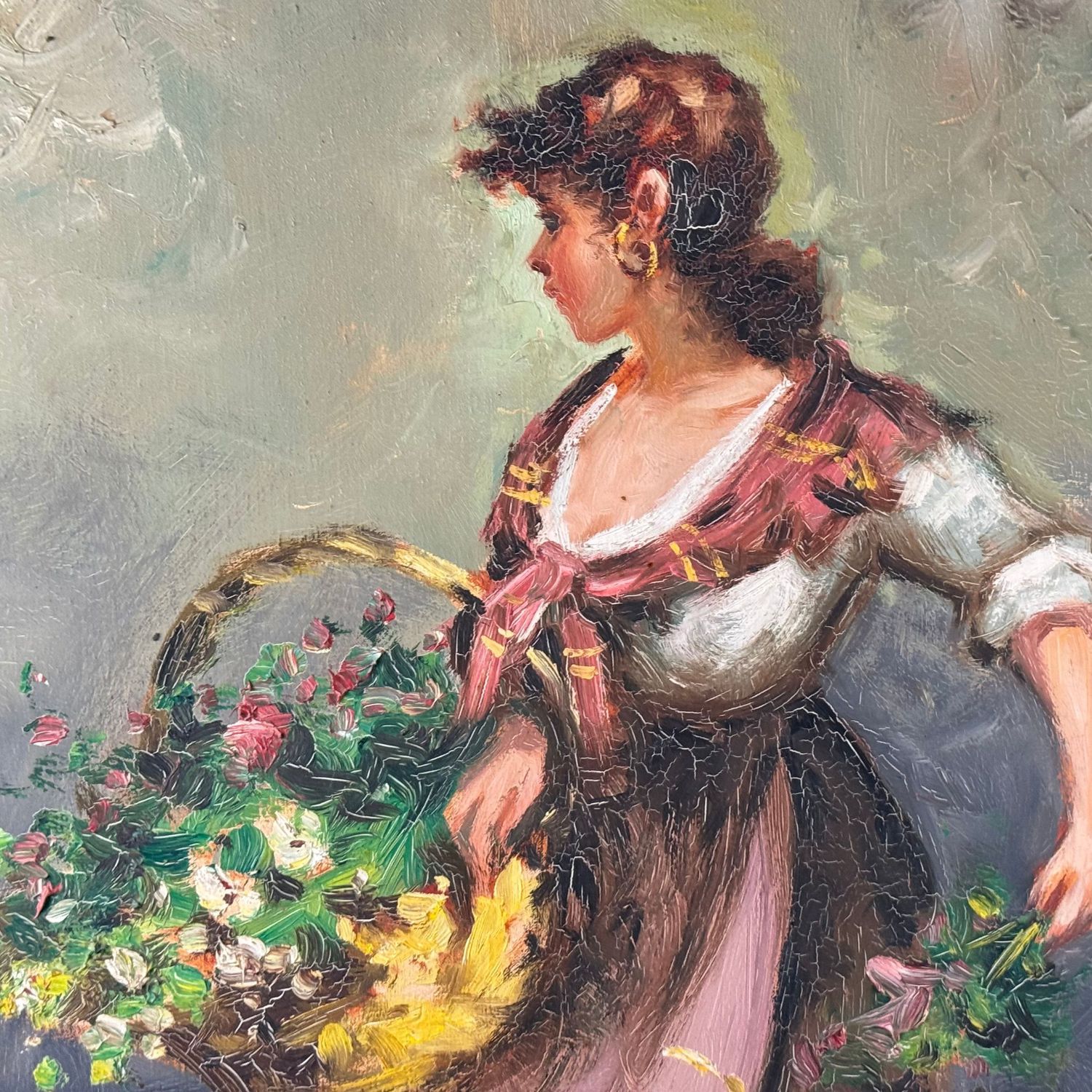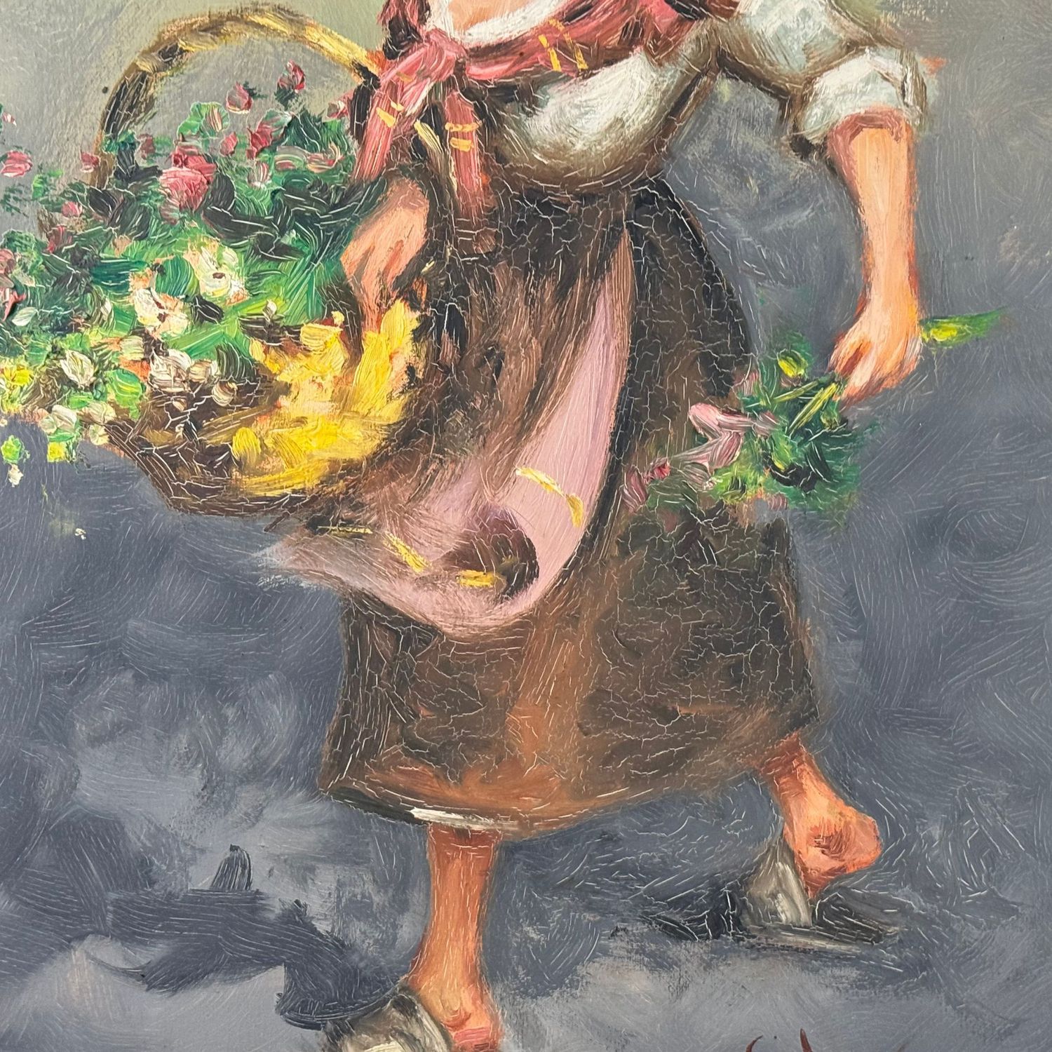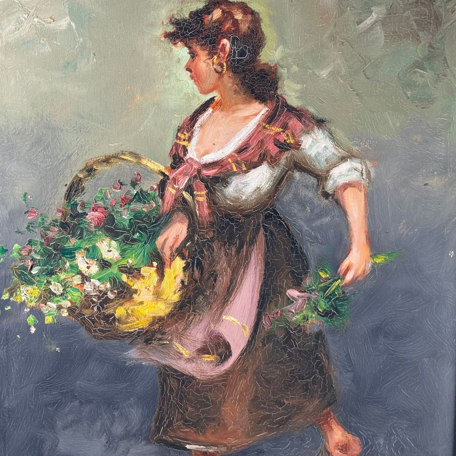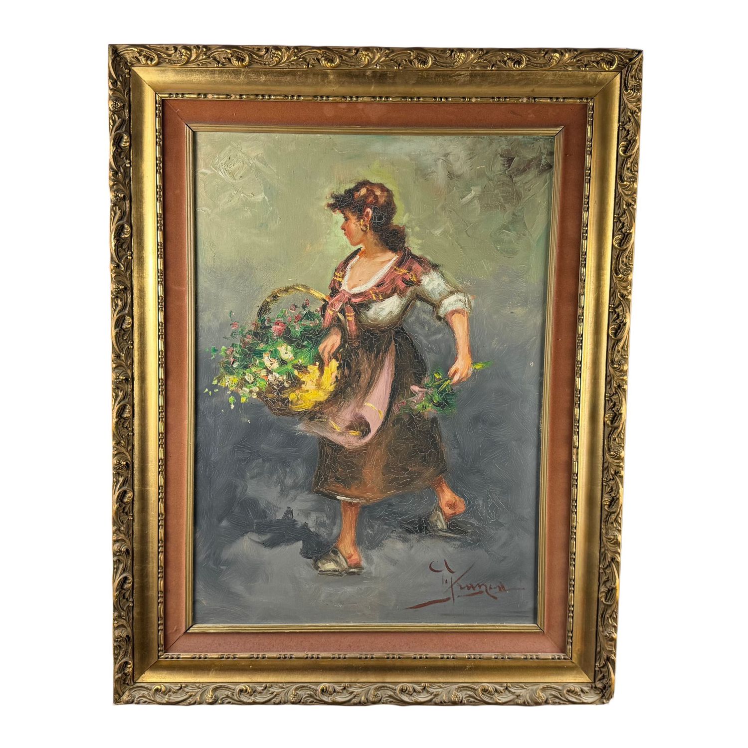 Dipinto olio su tela, periodo XX secolo scuola Italiana, raffigurante La raccolta di fiori. Dimensioni interno cornice: 50x70 cm. Dimensioni compreso cornice: 70x90 cm. Reca firma in basso a destra di difficile lettura. Opera in buone condizioni con lievi segni di vissuto come da foto allegate.