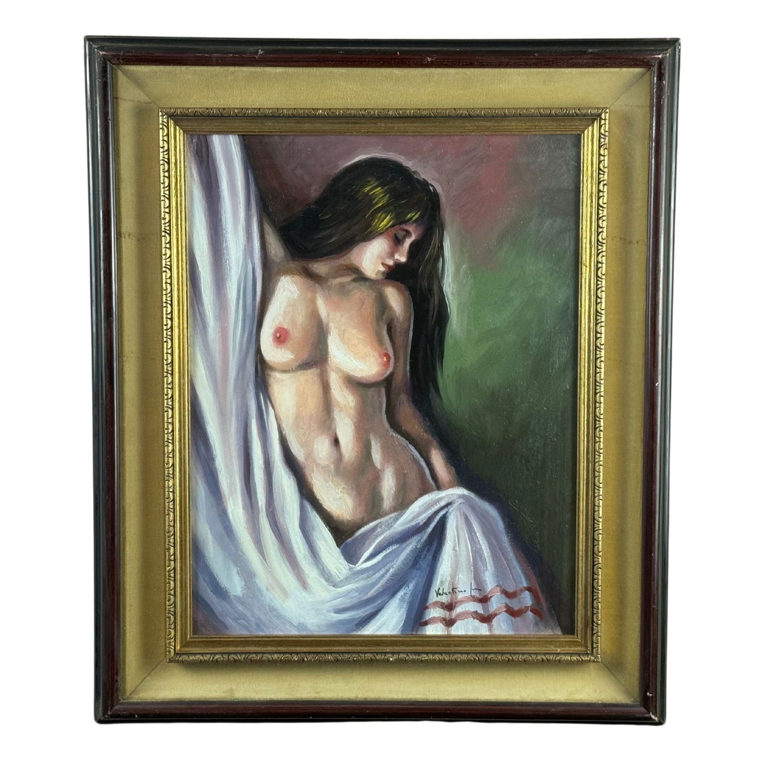 Dipinto olio su pannello, periodo XX secolo scuola Italiana, raffigurante nudo di donna. Dimensioni interno cornice: 35x45 cm. Dimensioni compreso cornice: 60x50. Reca firma in basso a destra da artista non identificato. Opera in buone condizioni.