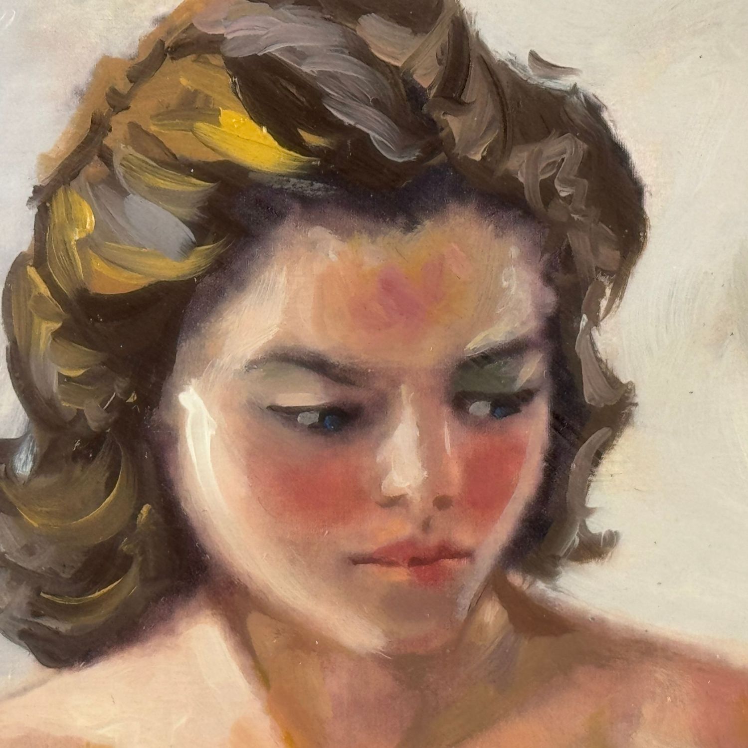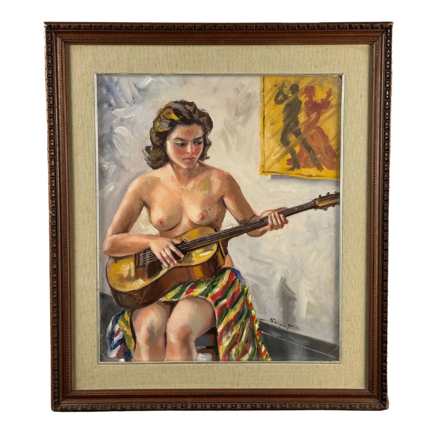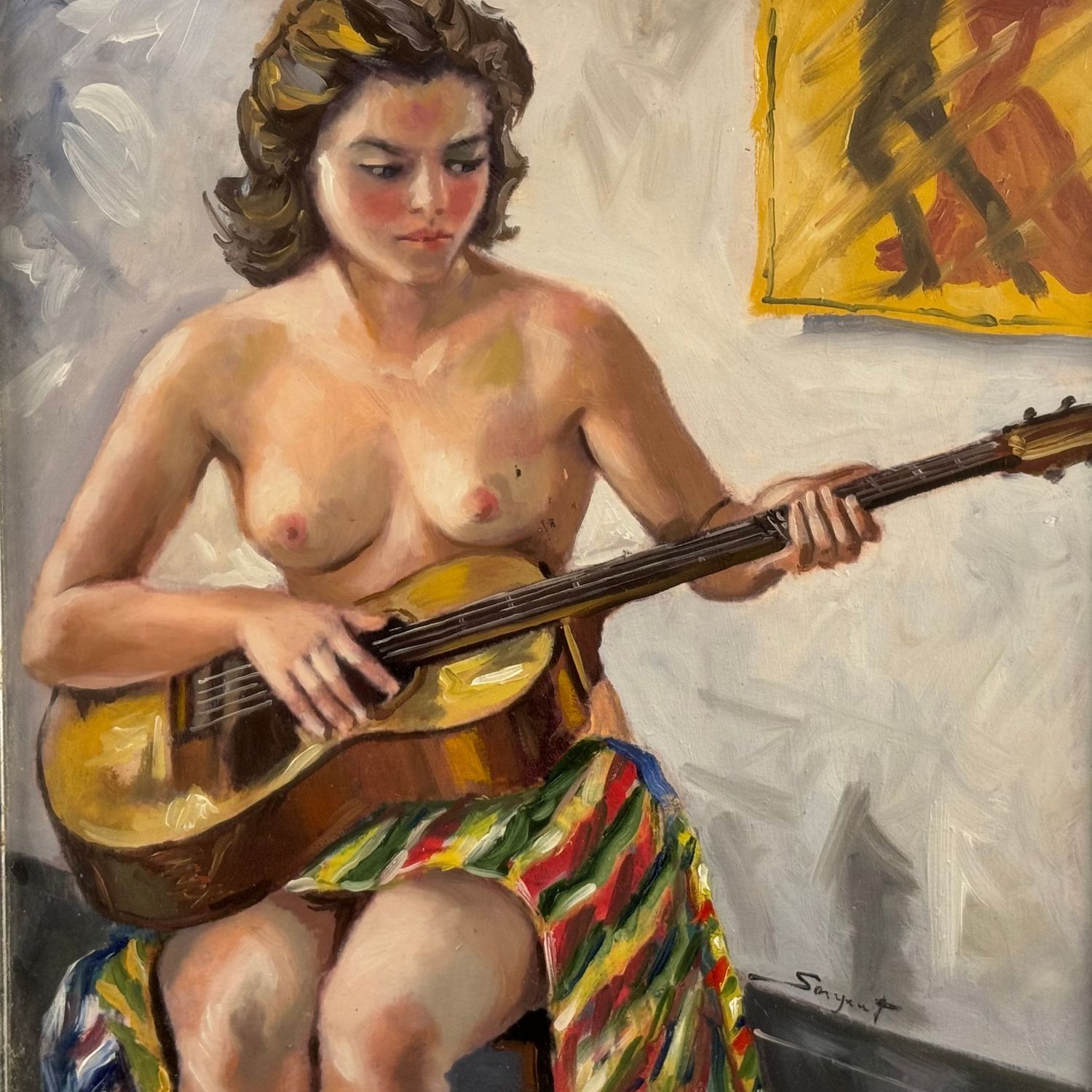 Dipinto olio su tavola, periodo XX secolo scuola Italiana, raffigurante Nudo di donna con chitarra. Dimensioni interno cornice: 40x48 cm. Dimensioni compreso cornice: 54x61. Reca firma in basso a destra da artista non identificato. Opera in buone condizioni.
