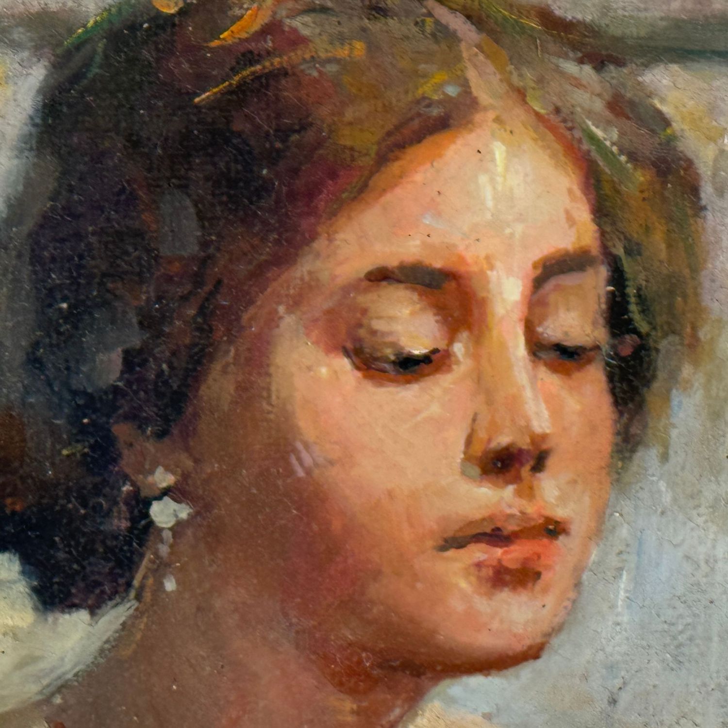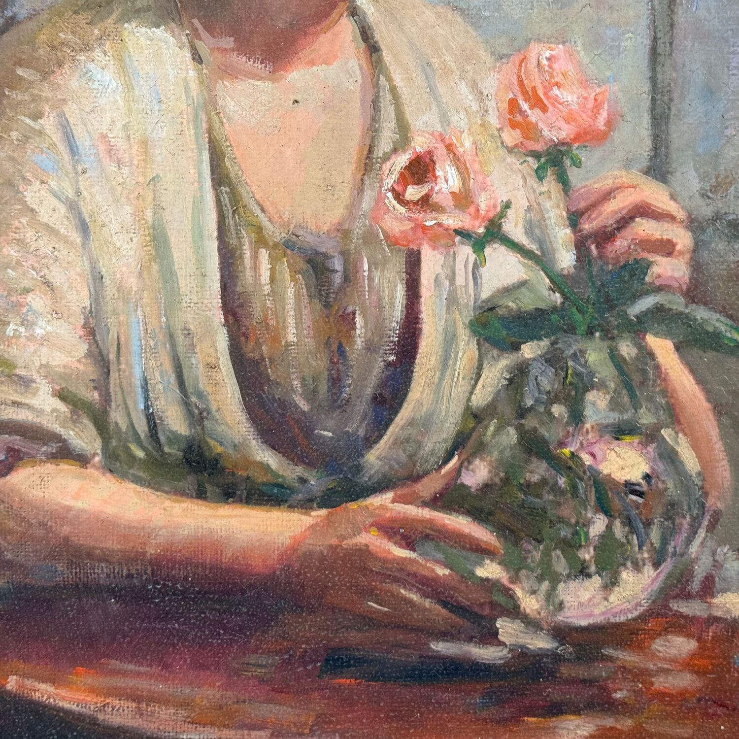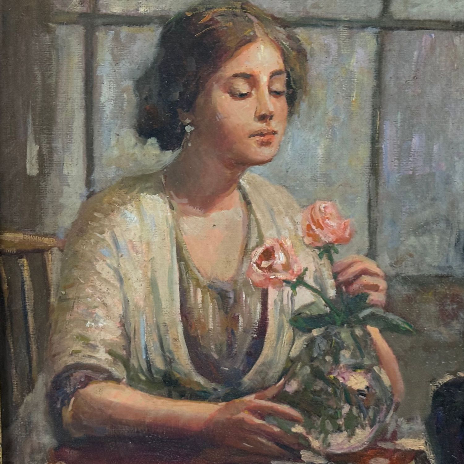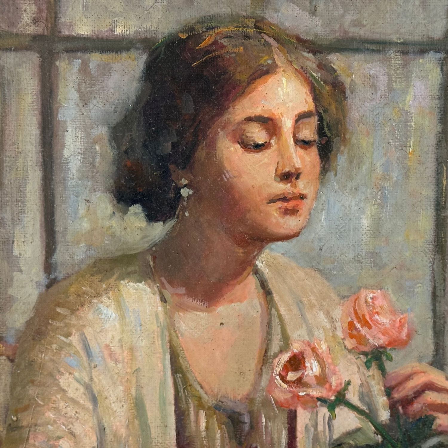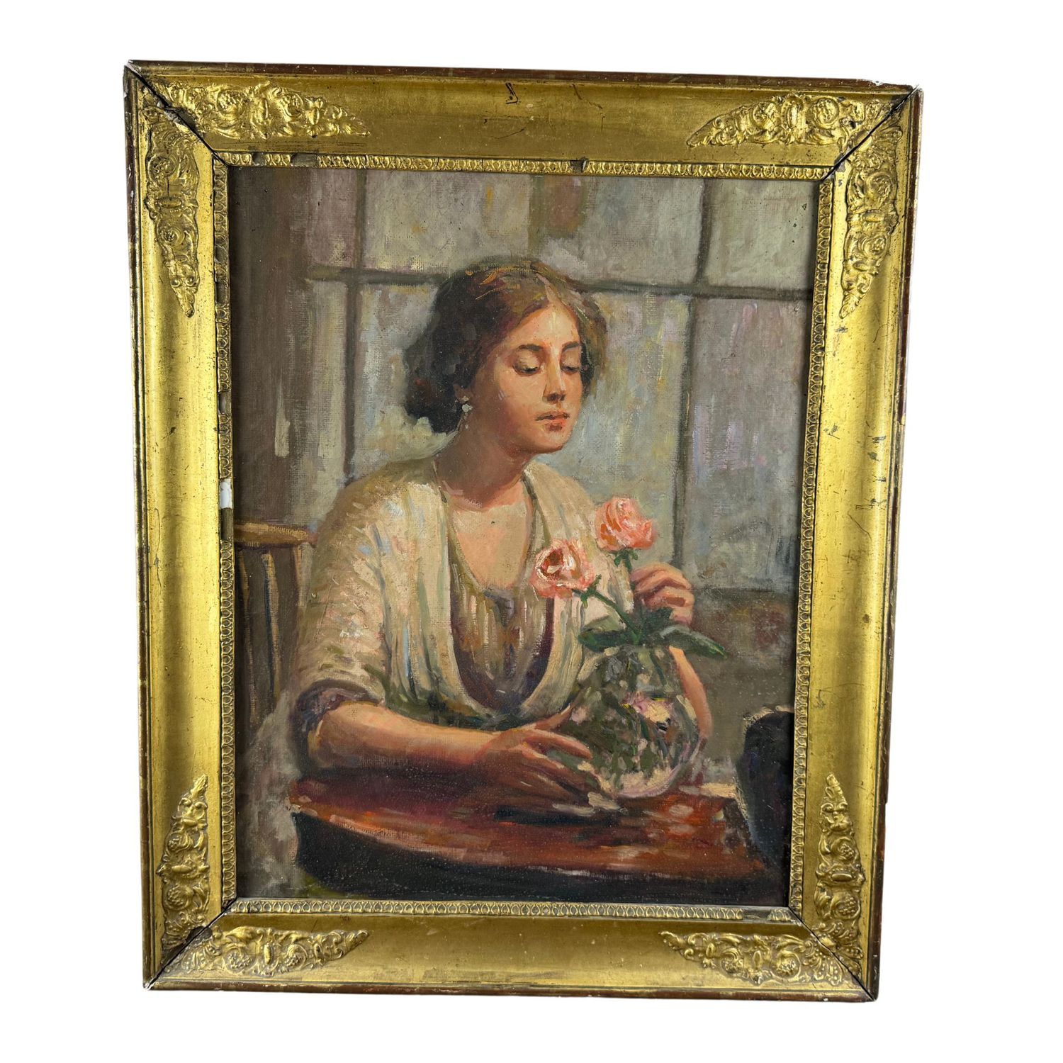 Dipinto olio su tela, periodo prima metà del XX secolo scuola italiana, raffigurante Donna con fiori. Dimensioni interno cornice: 48x60 cm. Dimensioni compreso cornice: 61x74 cm. Da artista anonimo. Opera in buone condizioni. Cornice da restaurare, da segnalere un recente rintelo e sostituzione del telaio.