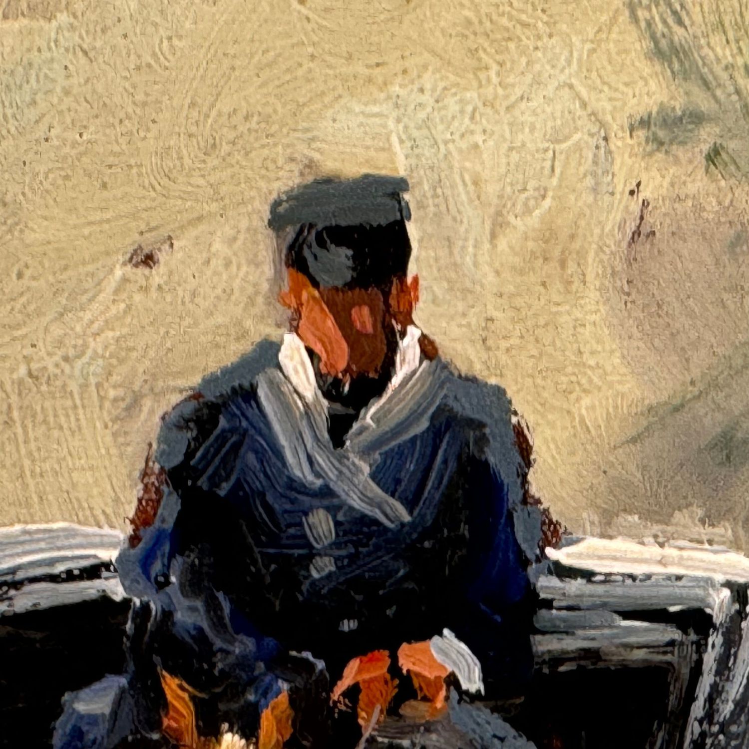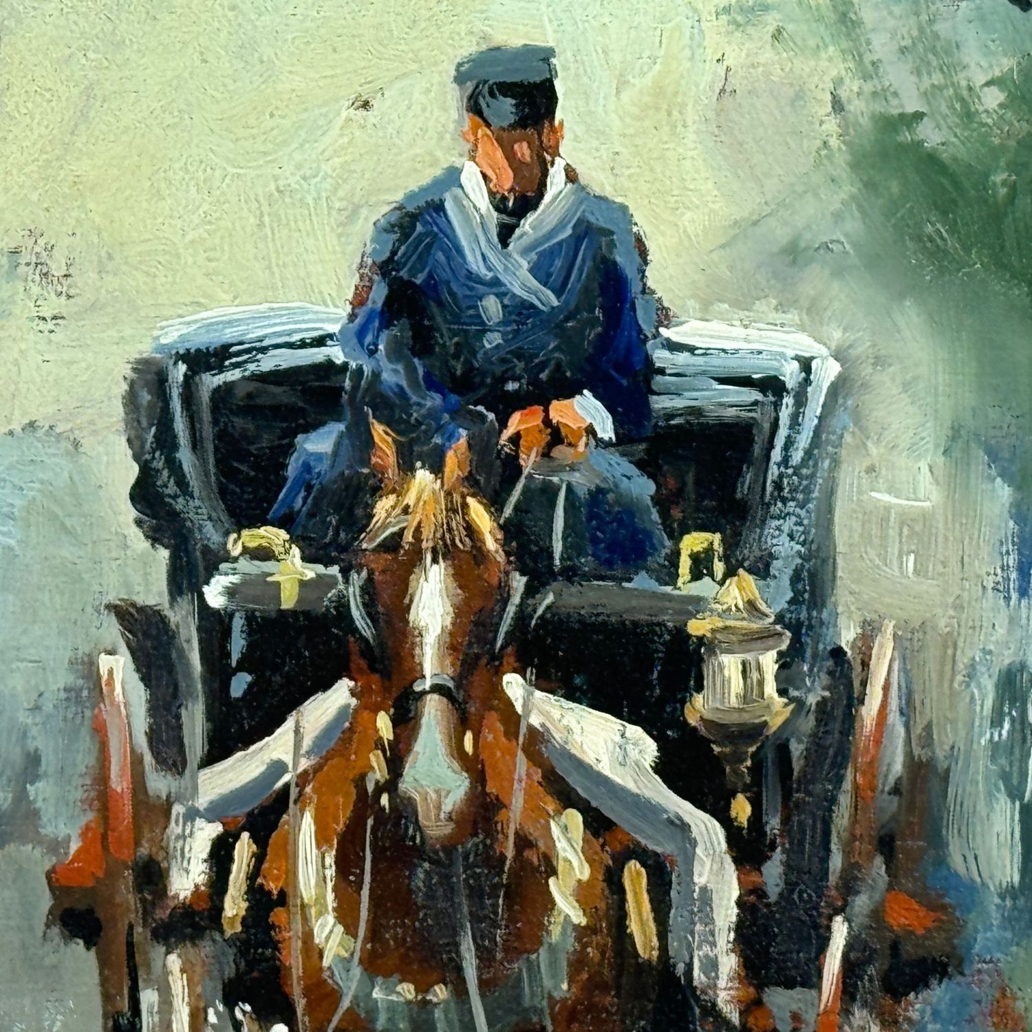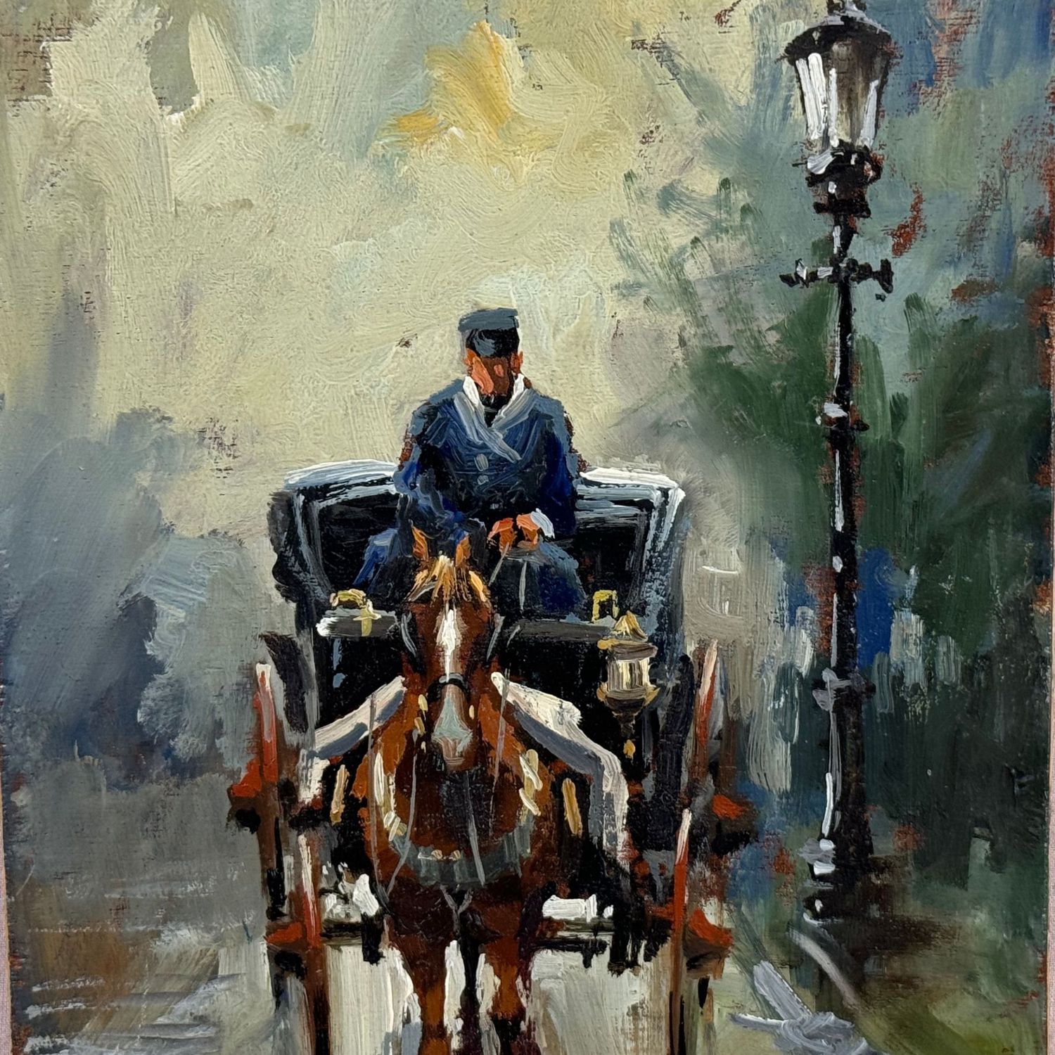 Dipinto olio su tavola, periodo XX secolo (1940 - 1950) scuola Italiana, raffigurante Strada con carrozza. Dimensioni: 17,5x30 cm. Traccia di firma in basso a destra da artista non identificato. Opera in buone condizioni e di ottima qualità artistica.
