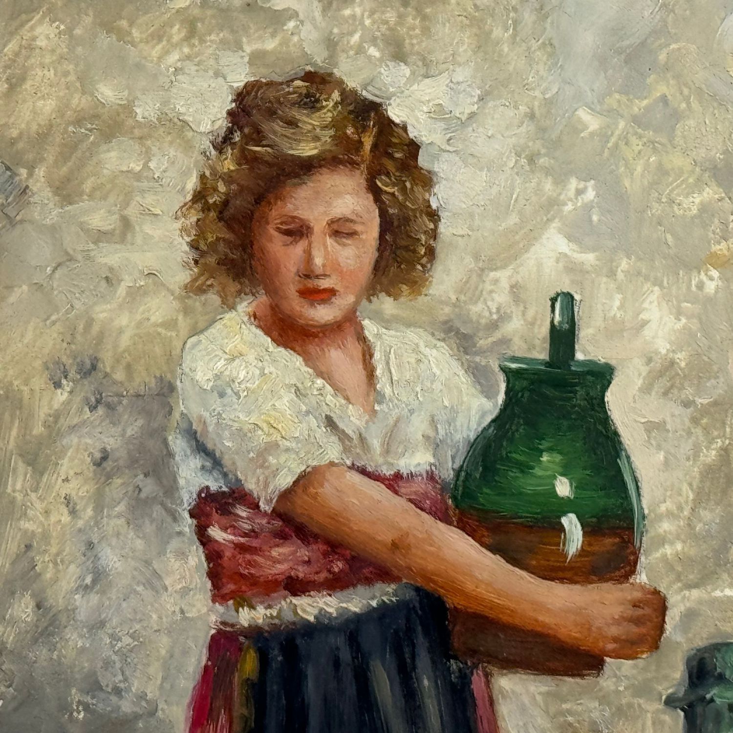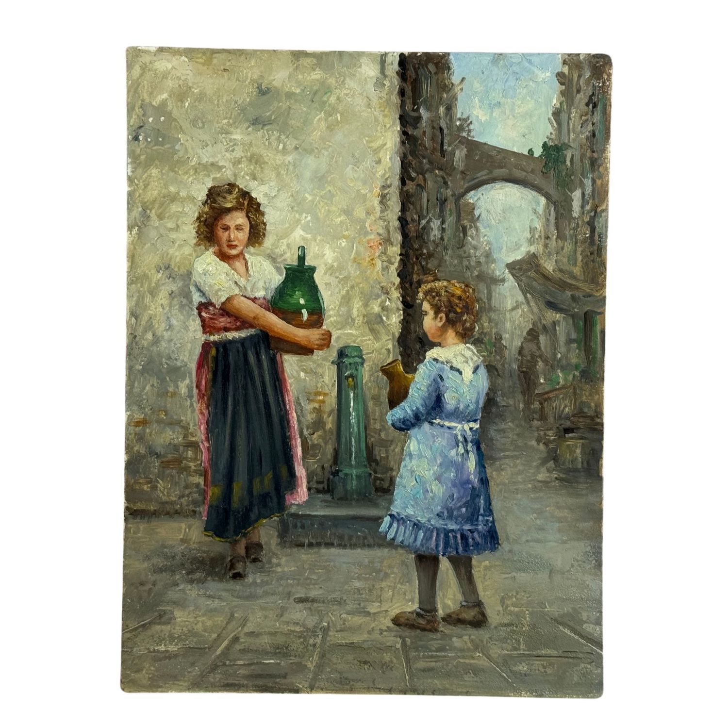 Dipinto olio su tavola, periodo XX secolo (1940 - 1950) scuola Italiana, raffigurante Bambini alla fontana. Dimensioni: 30x40 cm. Da artista anonimo. Opera in buone condizioni e di ottima qualità artistica.
