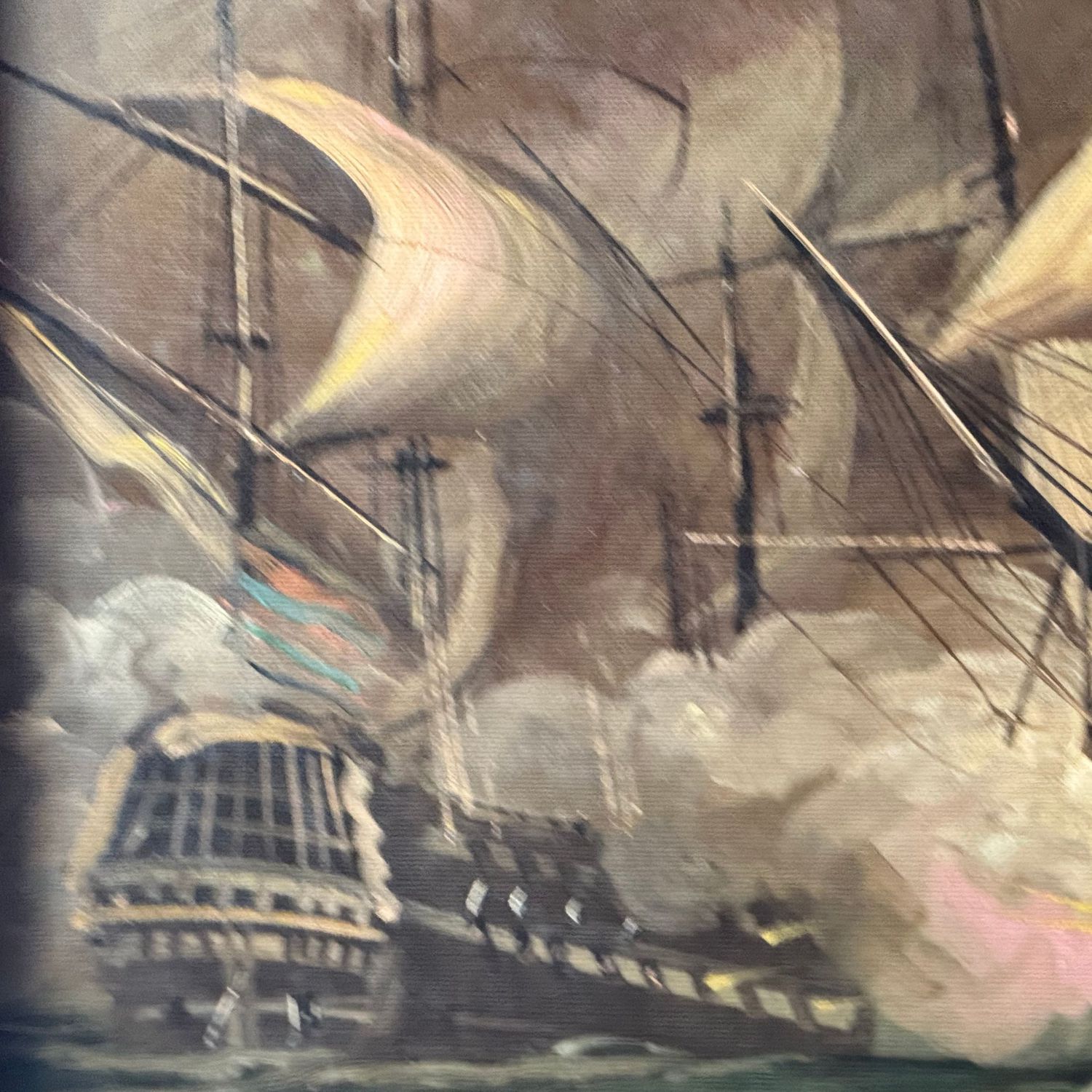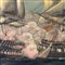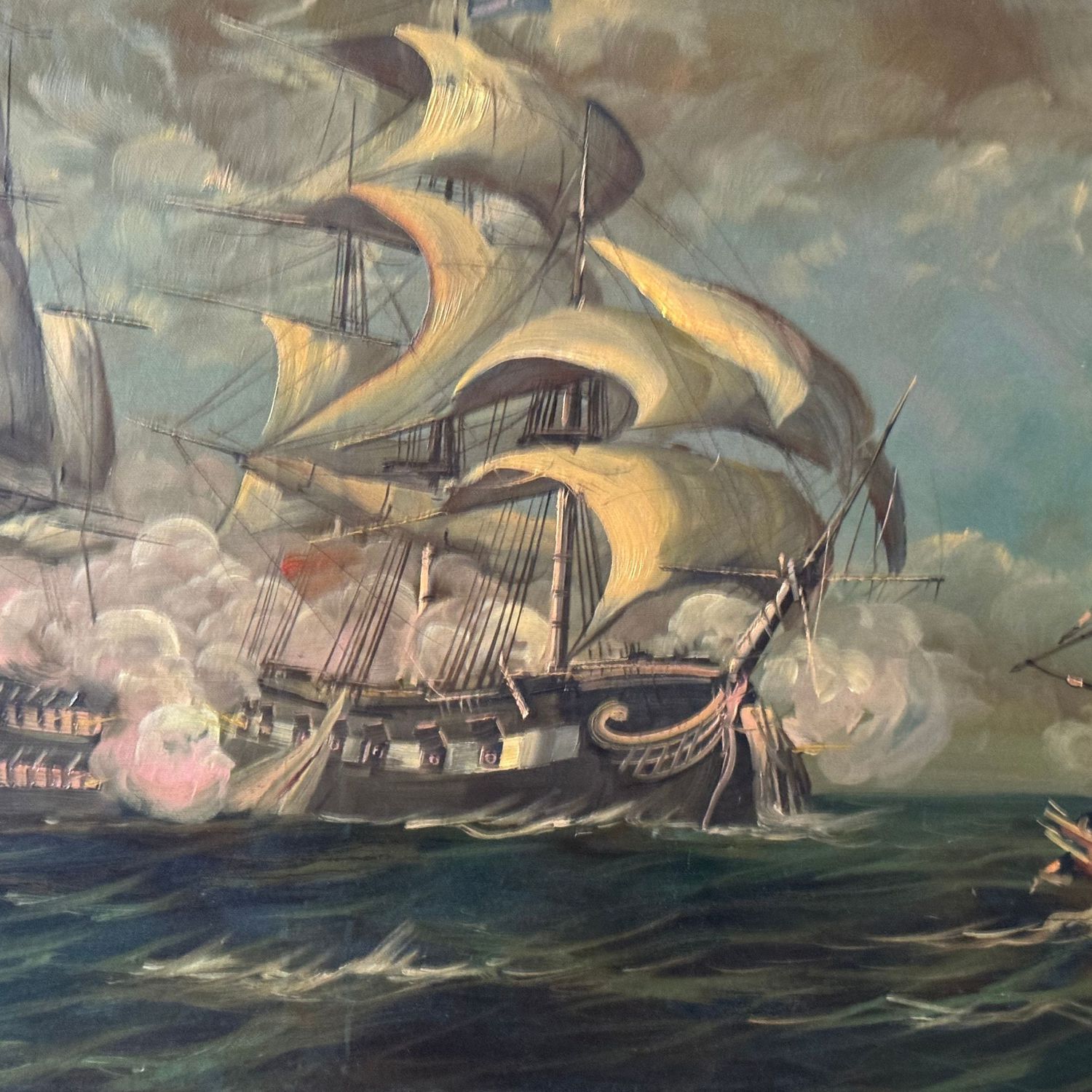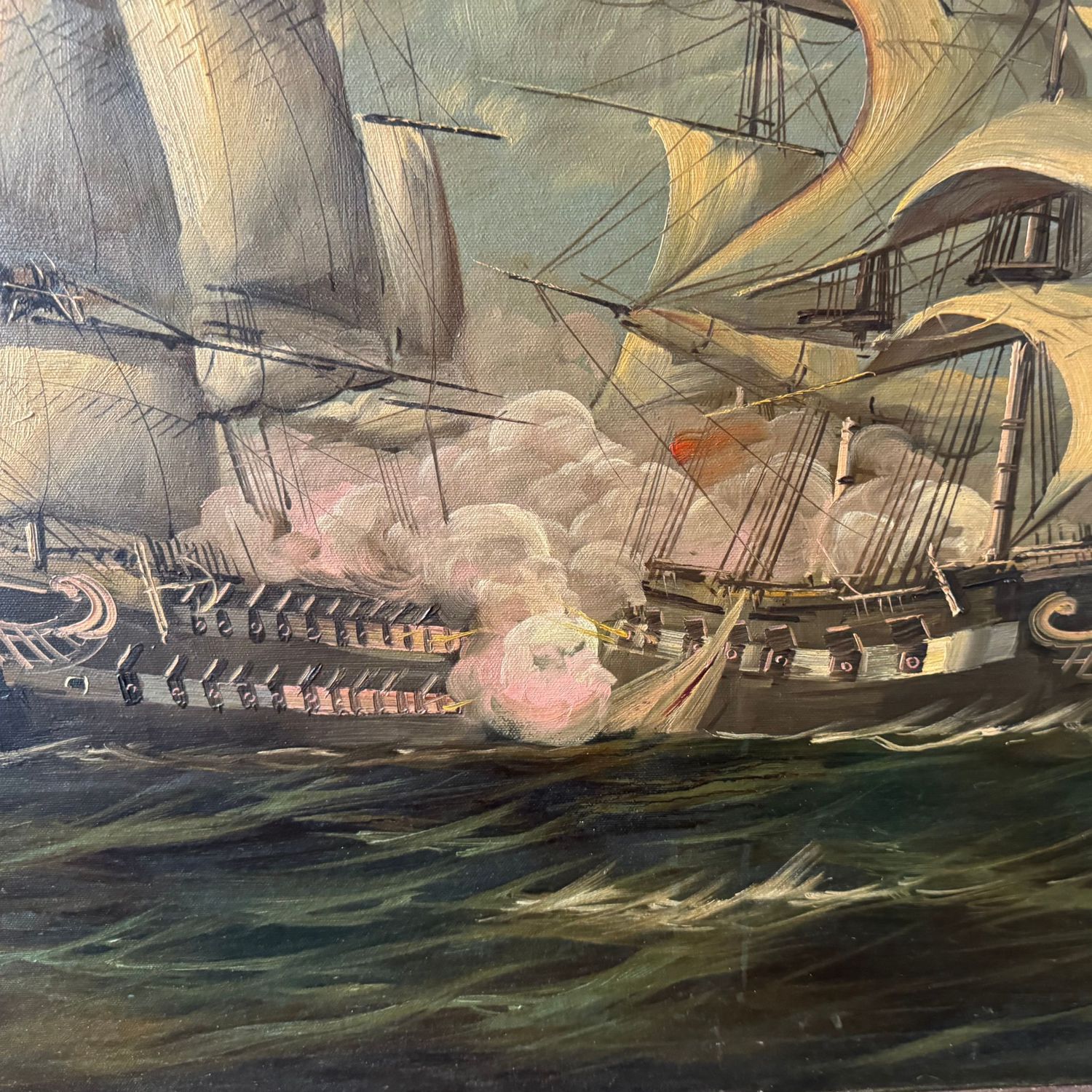 Dipinto olio su tela, periodo inizio XX secolo scuola Italiana, raffigurante Battaglia navale. Dimensioni interno cornice: 120x60 cm. Dimensioni compreso cornice: 122x62 cm. Reca firma in basso a destra di difficile lettura da artista non identificato. Opera in buone condizioni e di ottima qualità artistica.
