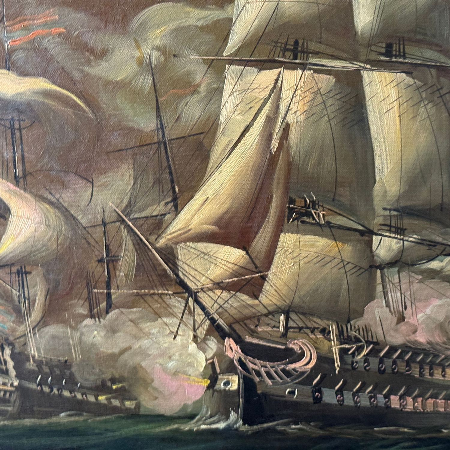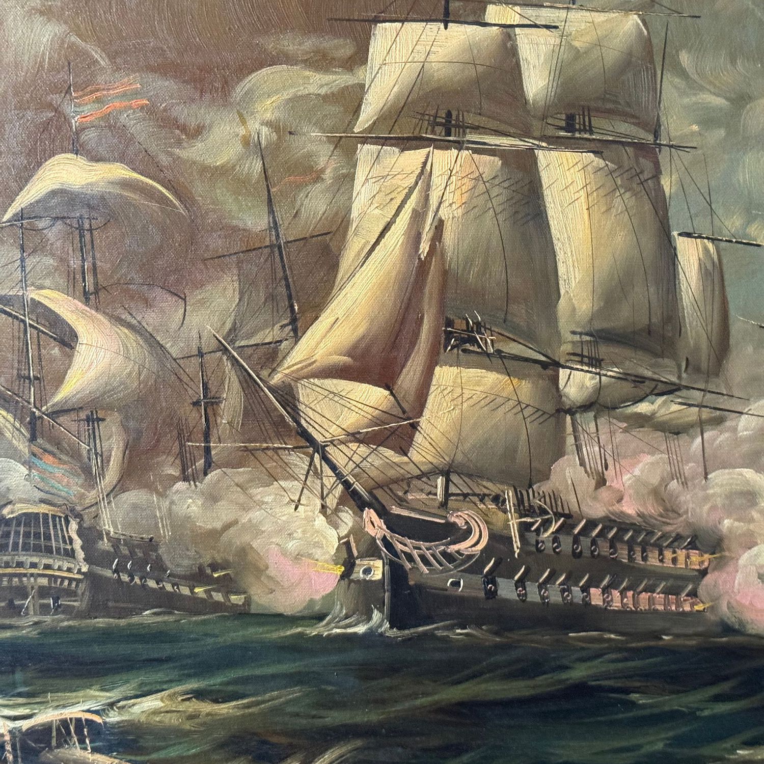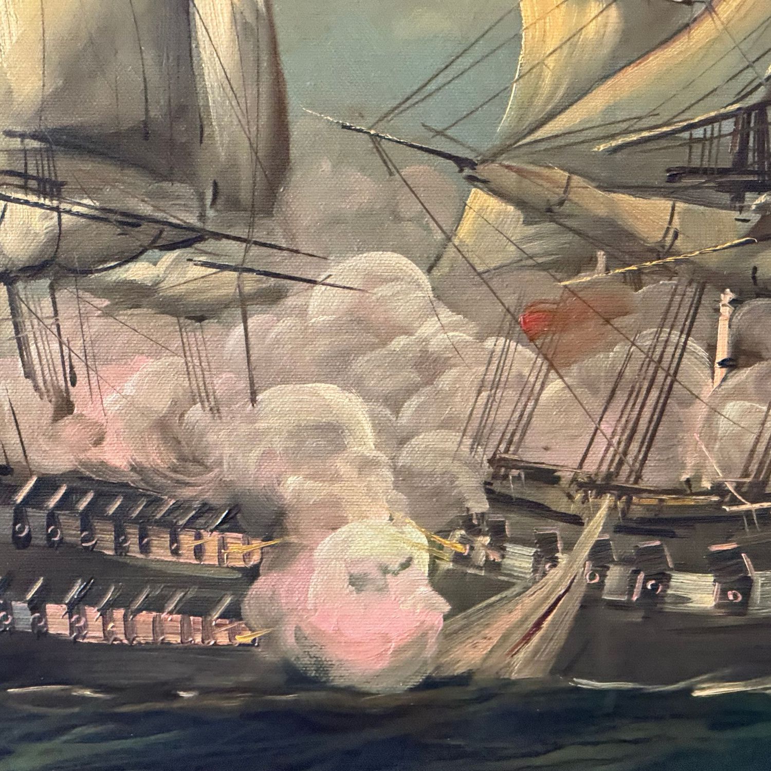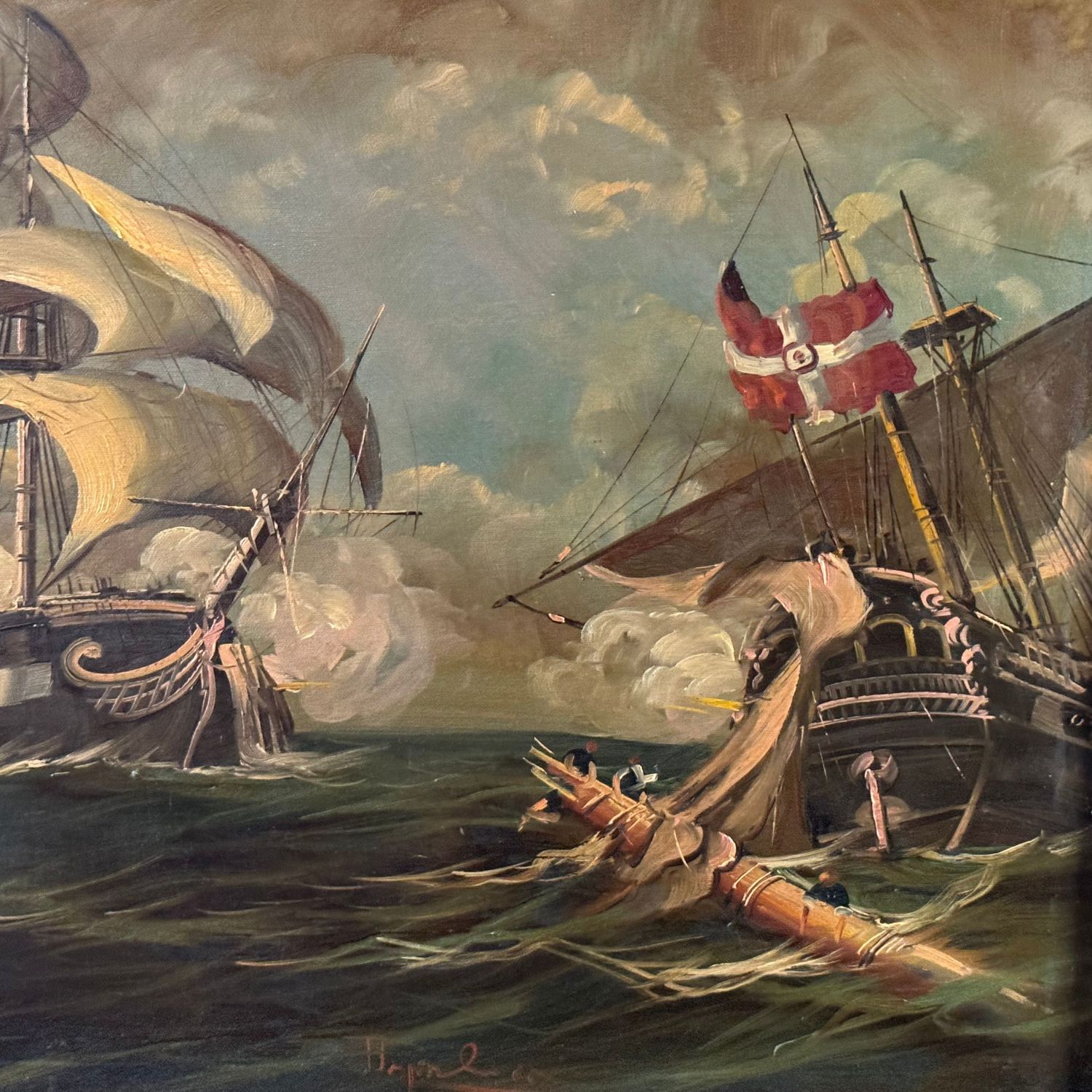 Dipinto olio su tela, periodo inizio XX secolo scuola Italiana, raffigurante Battaglia navale. Dimensioni interno cornice: 120x60 cm. Dimensioni compreso cornice: 122x62 cm. Reca firma in basso a destra di difficile lettura da artista non identificato. Opera in buone condizioni e di ottima qualità artistica.