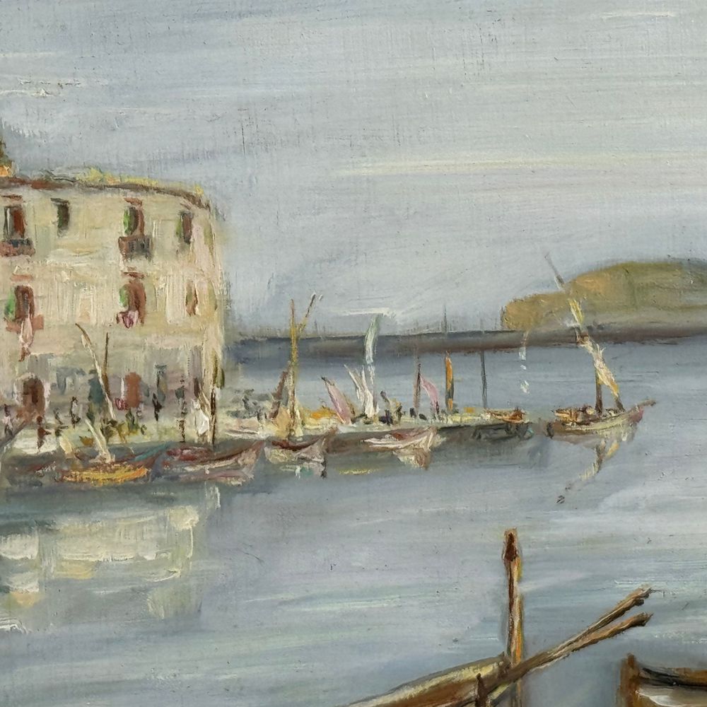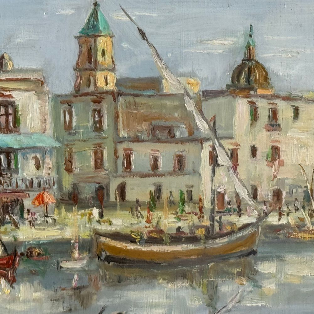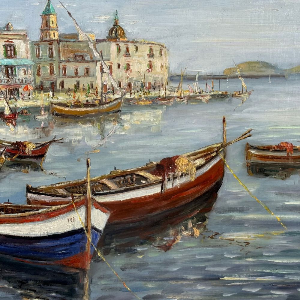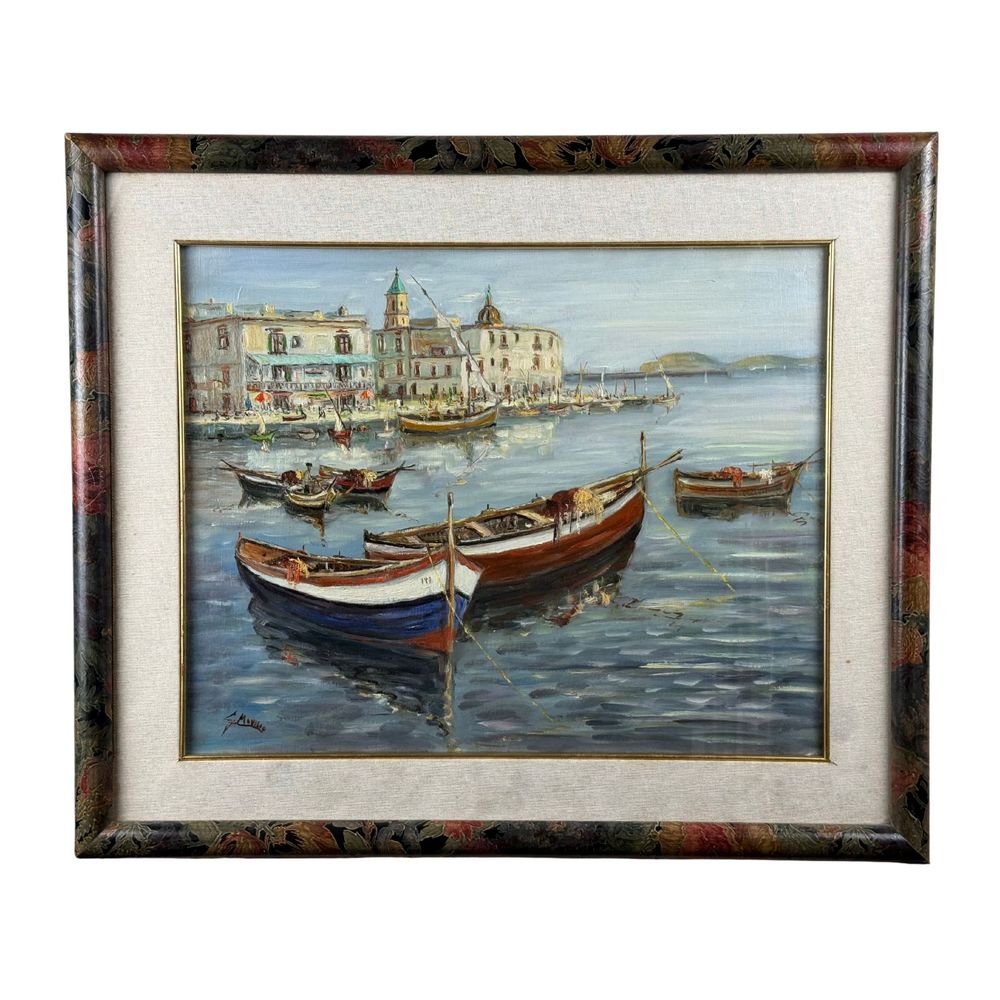 Dipinto olio su tela, periodo XX secolo scuola Italiana, raffigurante Marina a Pozzuoli. Dimensioni interno cornice: 50x40 cm. Dimensioni compreso cornice: 64x54 cm. Reca firma in basso a sinistra da artista non identificato. Opera di straordinaria qualità artistica e in ottime condizioni.