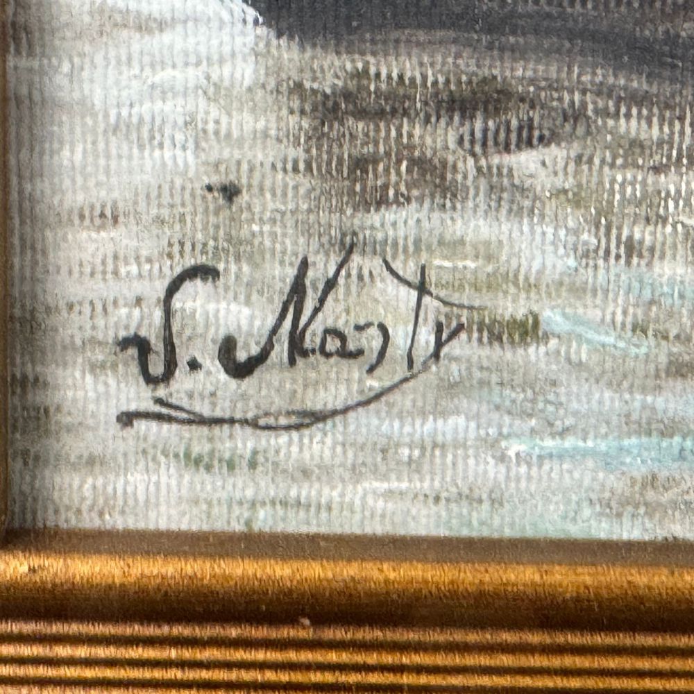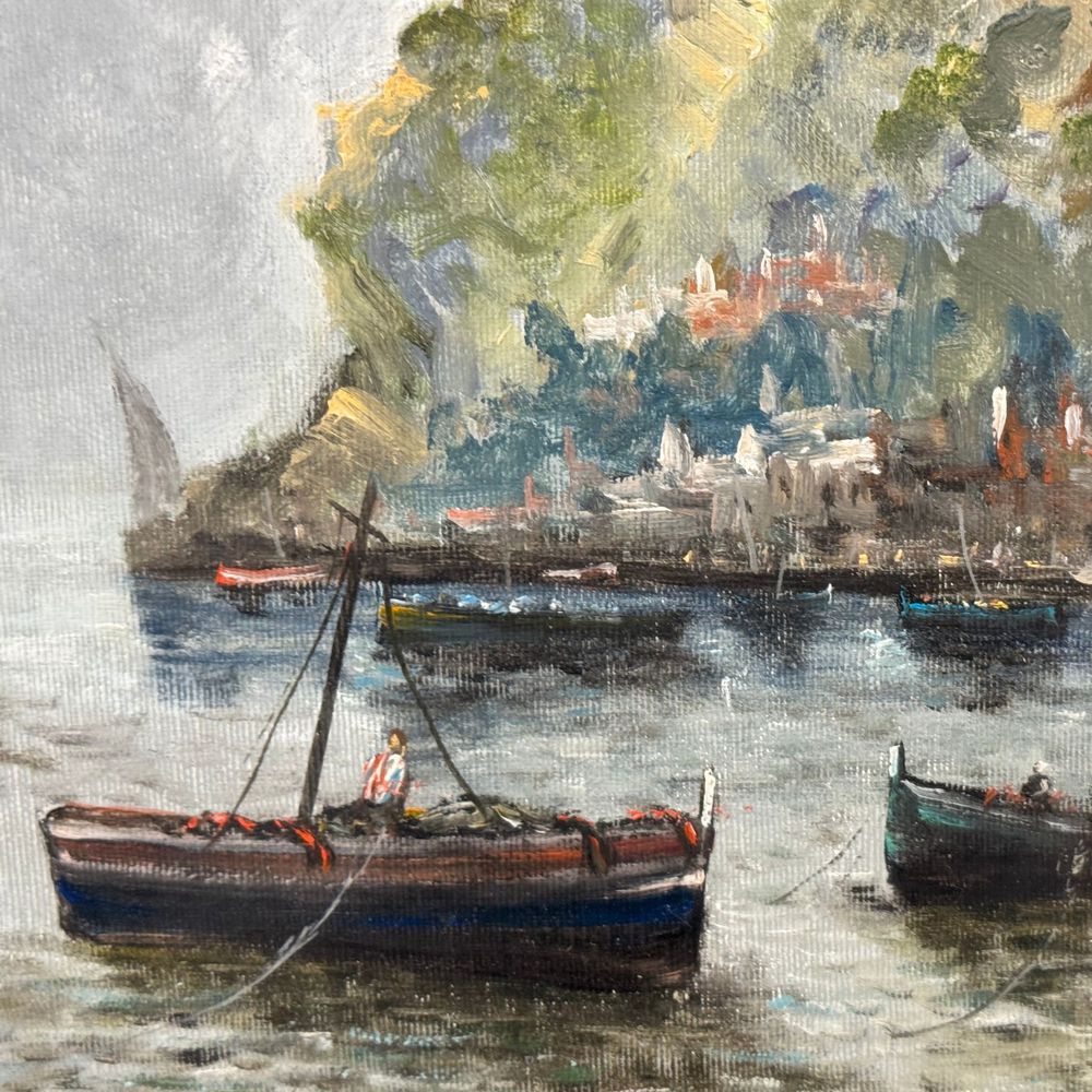 Dipinto olio su tela, periodo XX secolo scuola Italiana, raffigurante Marina con barche. Dimensioni interno cornice: 45x29 cm. Reca firma in basso a sinistra da S. Nasti.