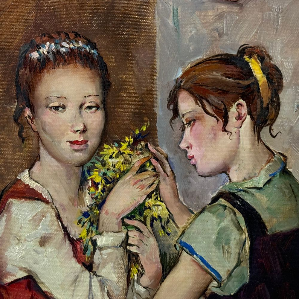 Dipinto olio su tela, periodo XX secolo scuola Italiana, raffigurante Due donne su balcone. Dimensioni: 40x30 cm. Reca firma in basso a destra da Ciro Adrian Ciavolino (1932). Opera in buone condizioni.