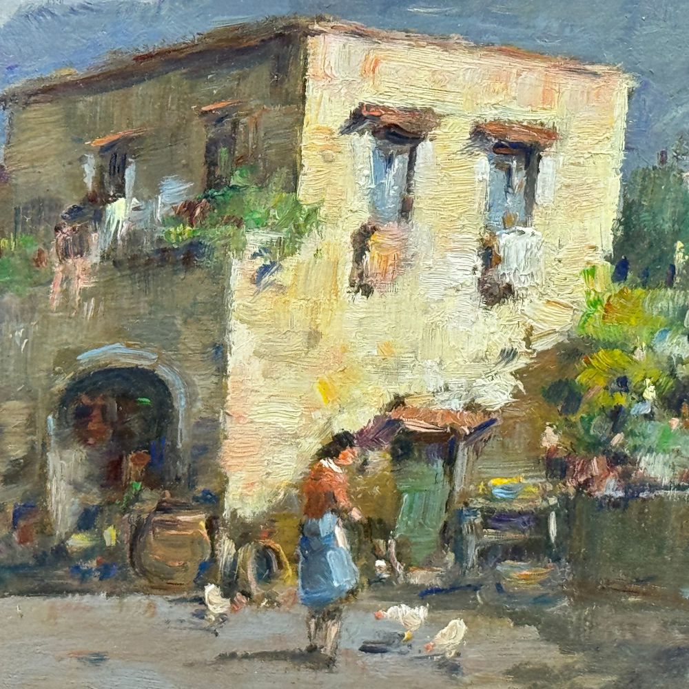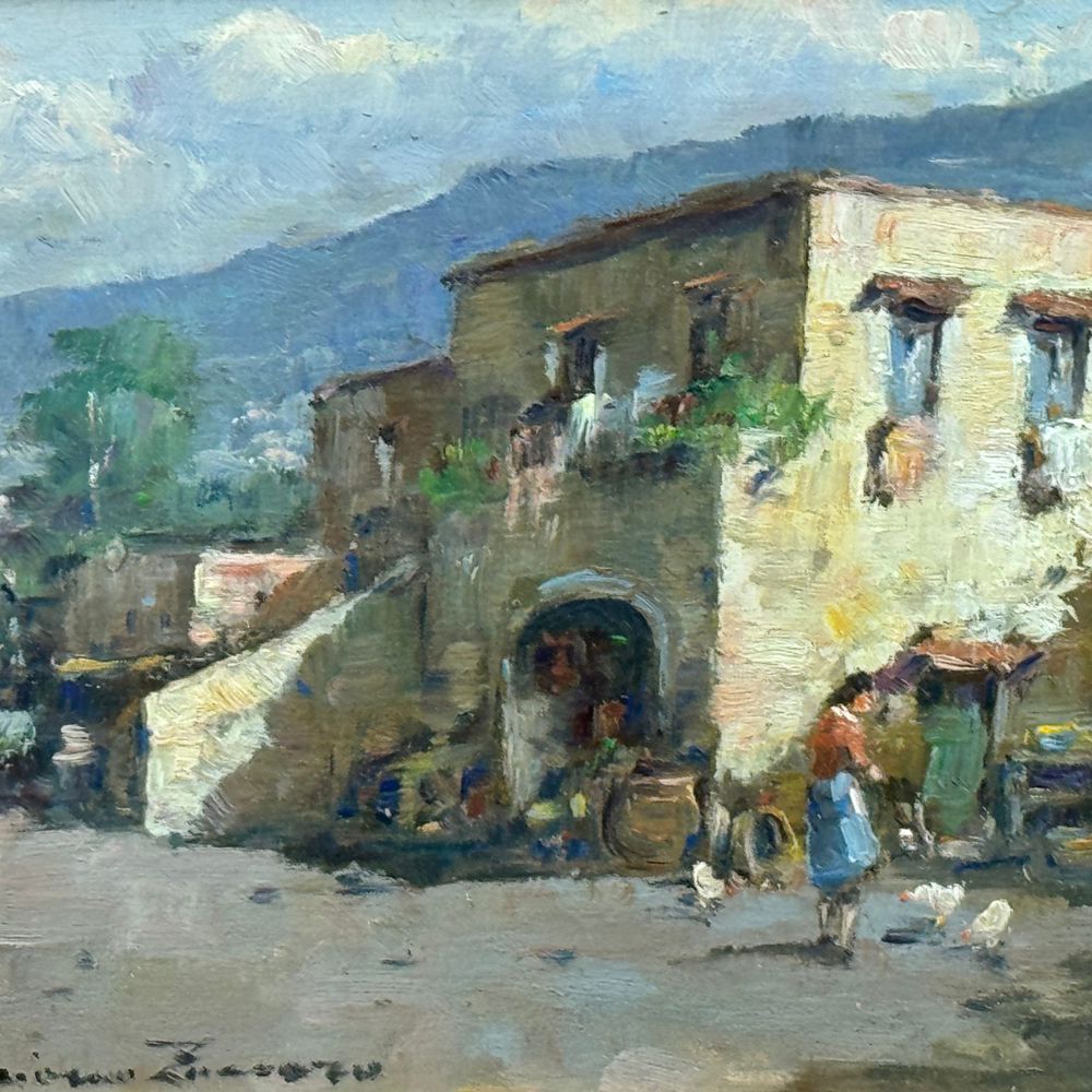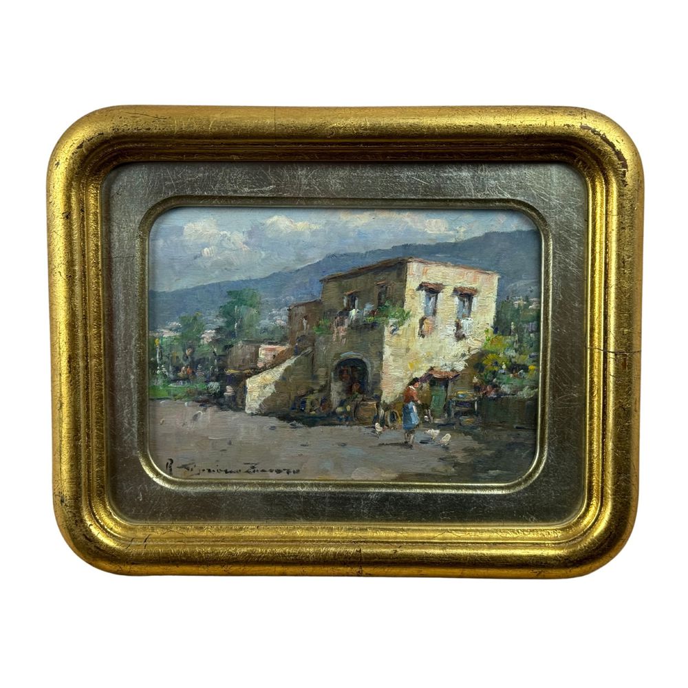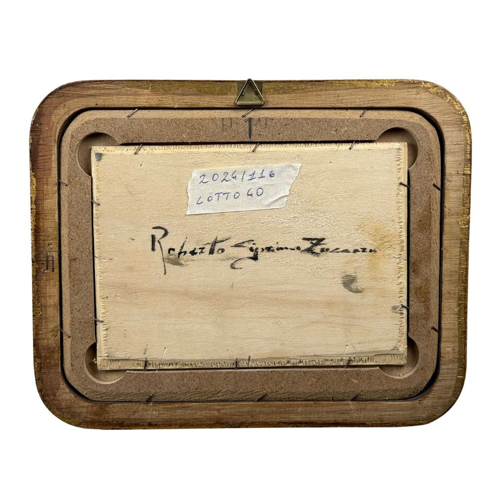 Dipinto olio su tavola, periodo XX secolo scuola Italiana, raffigurante paesaggio di campagna. Dimensioni interno cornice: 18x13 cm. Dimensioni compreso cornice: 25x20 cm. Firma in basso a sinistra da Roberto Cipriani Zuccaro. Opera in buone condizioni.