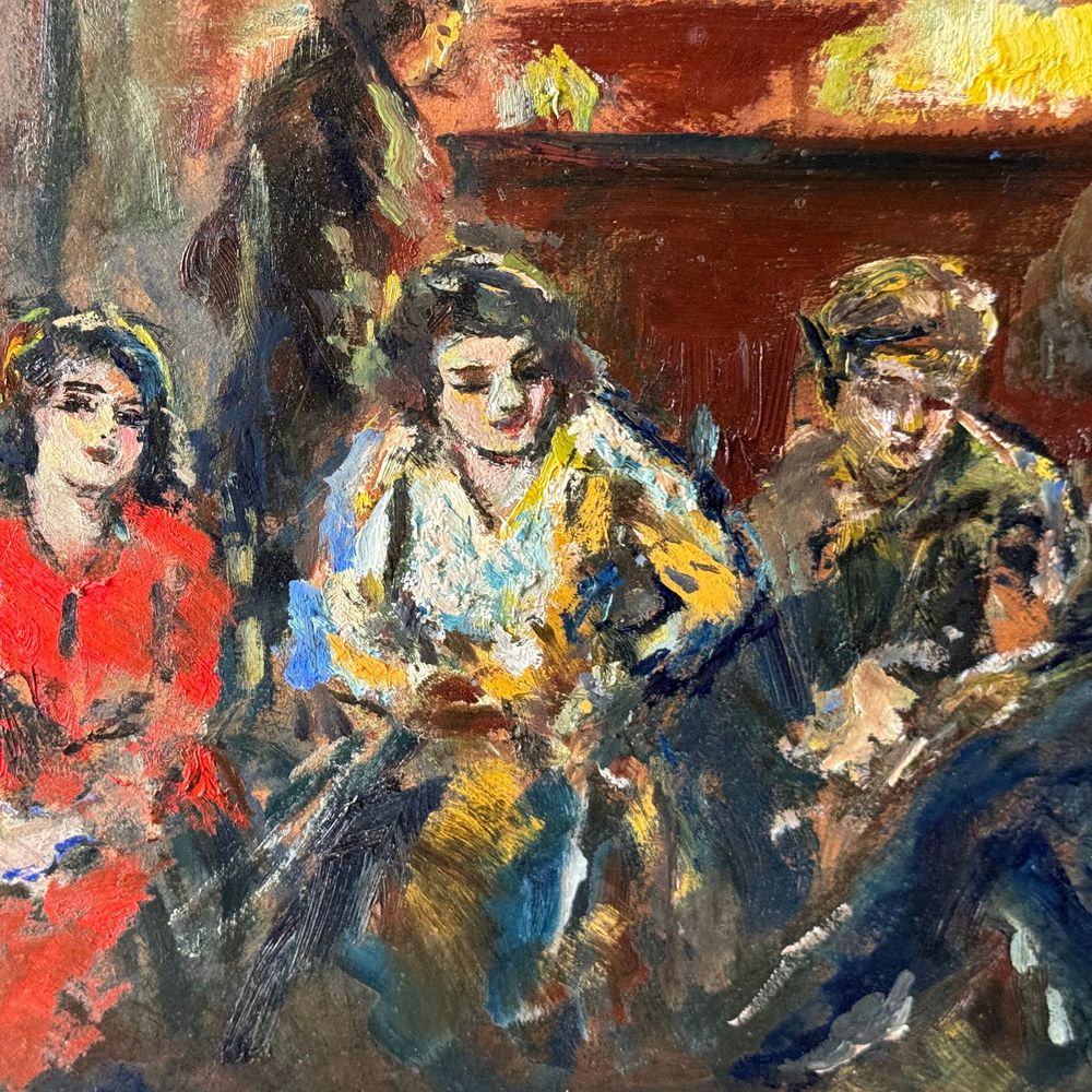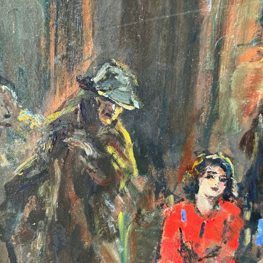 Dipinto olio su pannello, periodo XX secolo scuola italiana, raffigurante Personaggi. Dimensioni interno cornice: 43x33 cm. Dimensioni compreso cornice: 52x43 cm. Reca firma in basso a sinistra da Vincenzo Labella. Opera in buone condizioni.