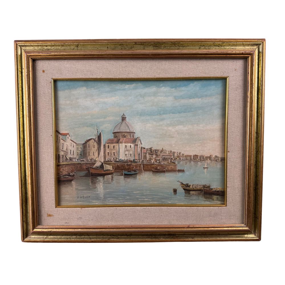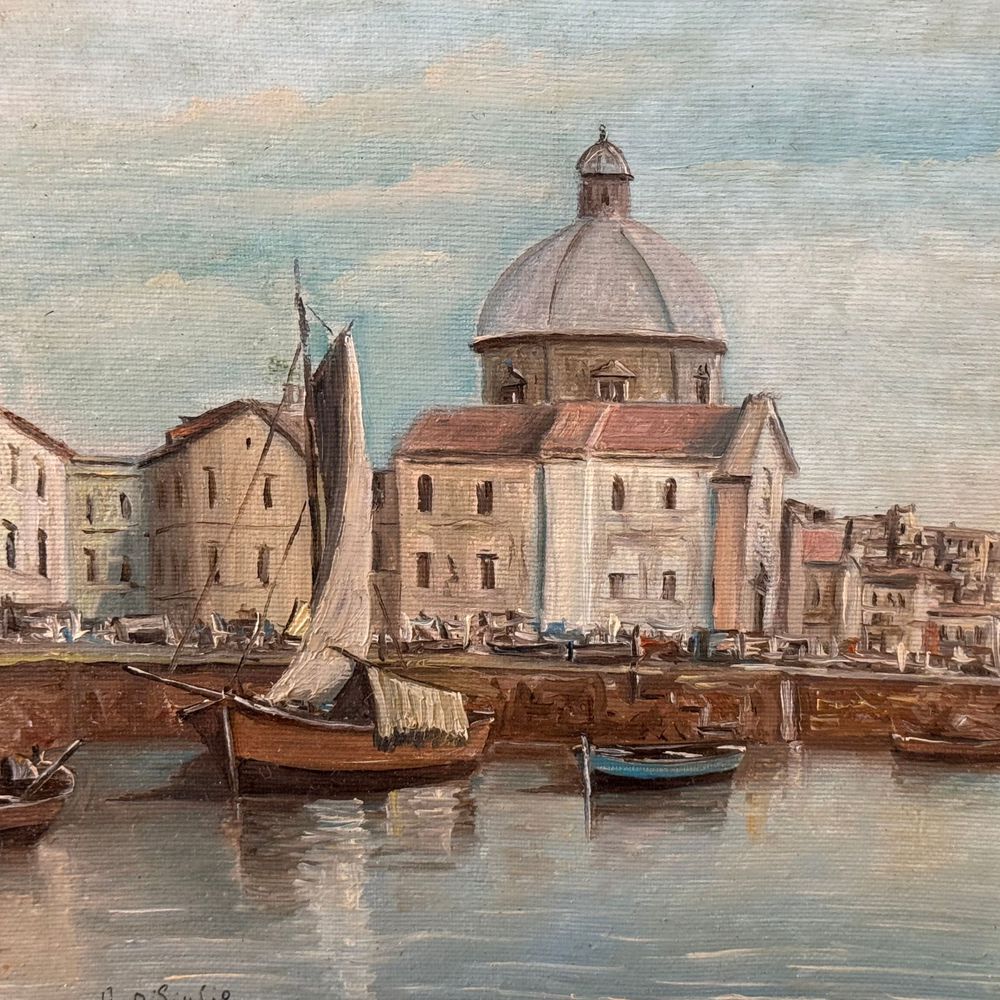 Dipinto olio su tela, periodo XX secolo scuola Italiana, raffigurante Scorcio di marina. Dimensioni interno cornice: 40x30 cm. Dimensioni compreso cornice: 46x55 cm. Reca firma in basso a sinistra da A. Di Giulio. Opera in buone condizioni.