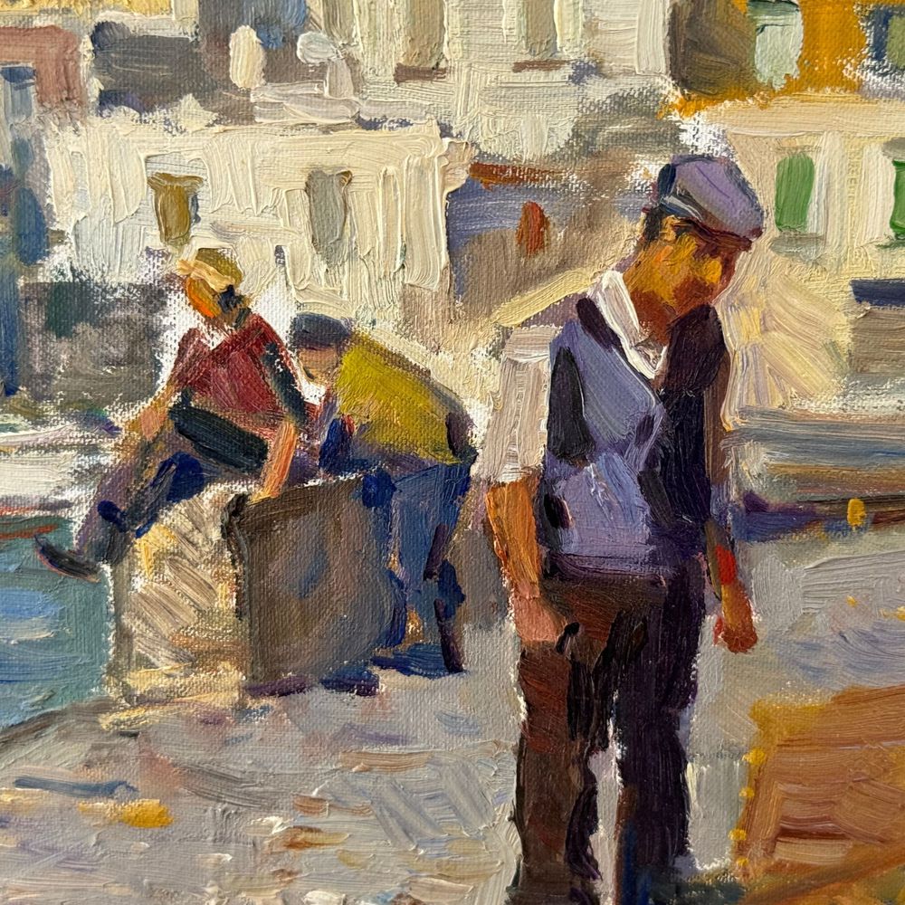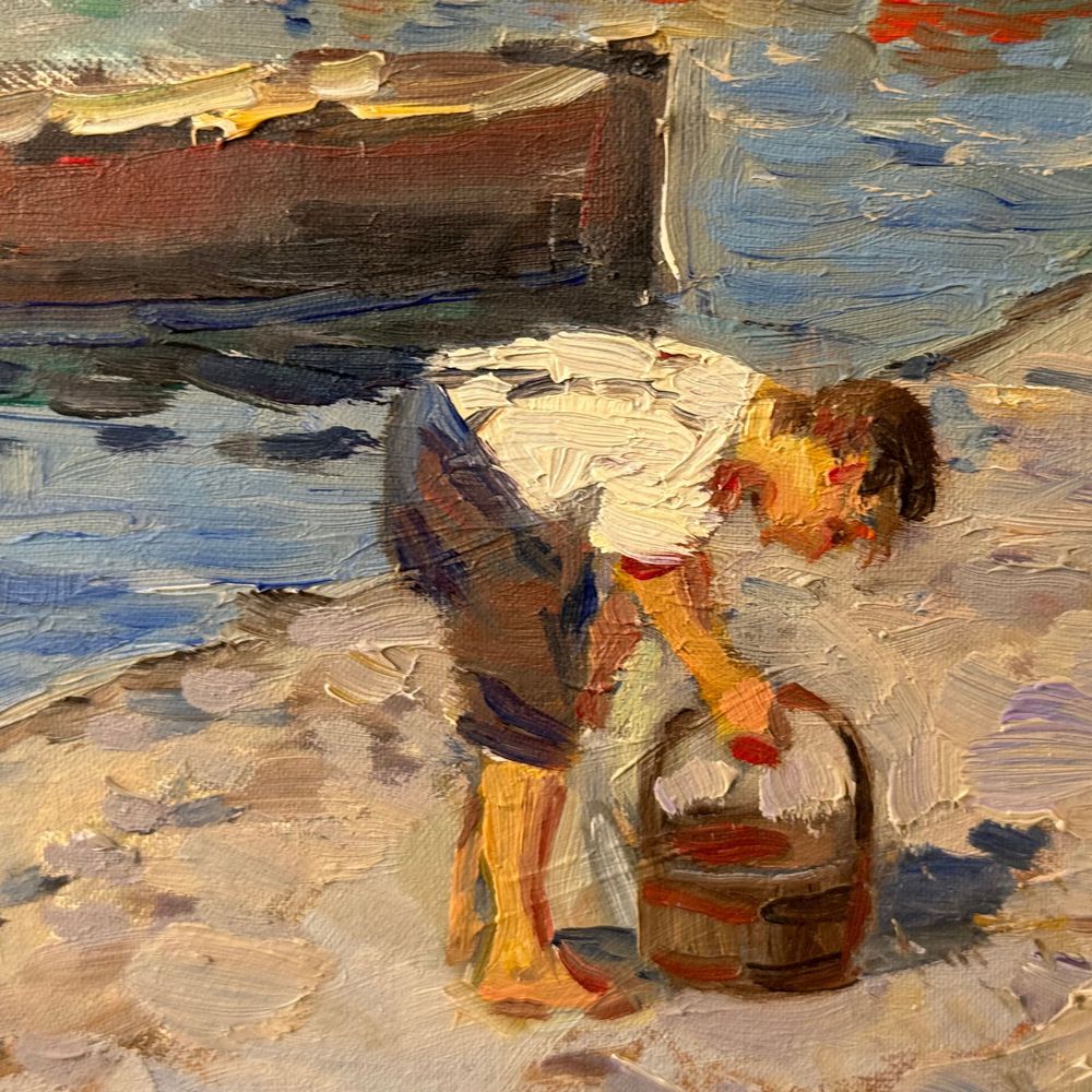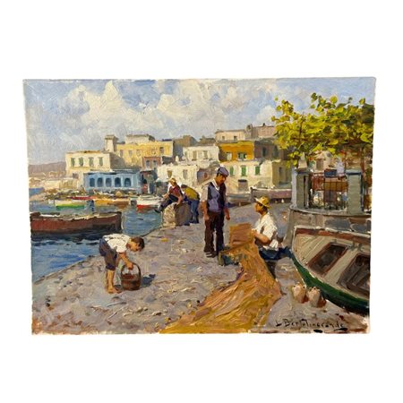 Dipinto olio su tela applicata su cartoncino, periodo XX secolo scuola Italiana, raffigurante Pescatori. Dimensioni: 40x30. Reca firma in basso a destra da Luigi Bertolingrande (1903 - 1977). Opera in buone condizioni.