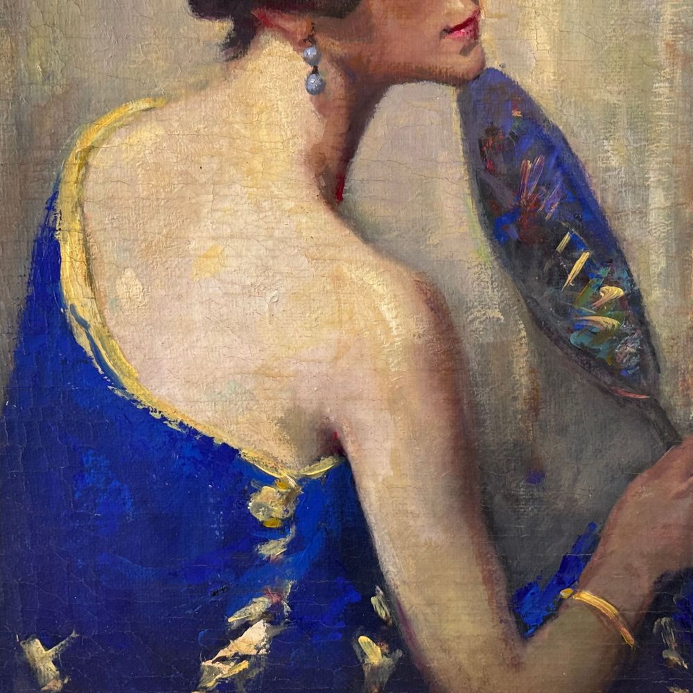 Dipinto olio su tela, periodo XX secolo scuola italiana, raffigurante Donna con ventaglio. Dimensioni: 43x57 cm. Reca firma in basso a destra di difficile lettura. Opera in buone condizioni con lievi segni di vissuto come da foto allegate.