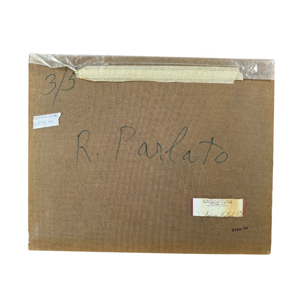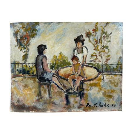 Dipinto olio su pannello, periodo XX secolo scuola Italiana, raffigurante Personaggi in giardino. Dimensioni. 50x40 cm. Firma in basso a destra da Renato Parlato. Opera in buone condizioni.