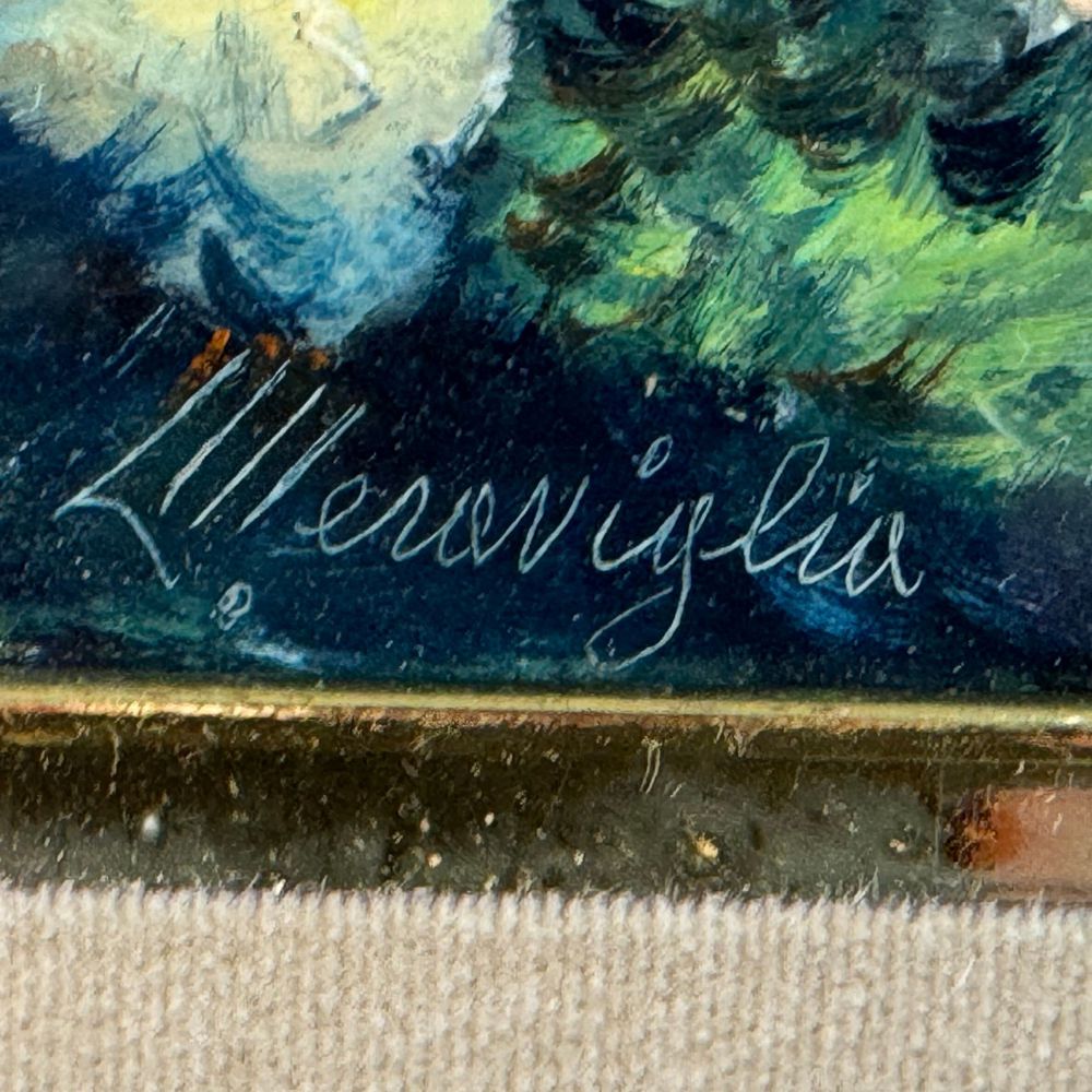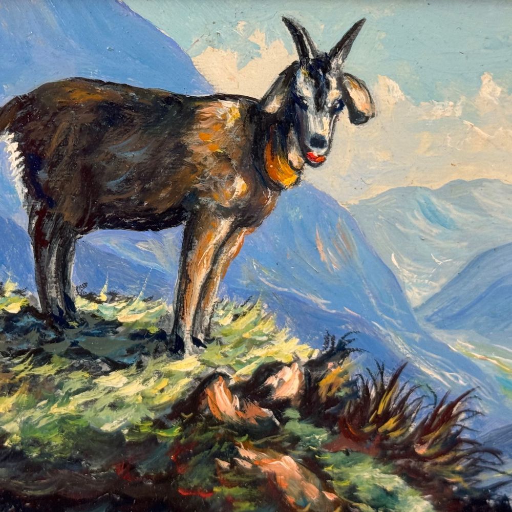 Dipinto olio su tavoletta, periodo XX secolo scuola Italiana, raffigurante Capretta. Dimensioni interno cornice: 18x13 cm. Dimensioni compreso cornice: 33x38 cm. Firma in basso a sinistra da Carmine Meraviglia (Napoli 1945). Opera in buone condizioni.