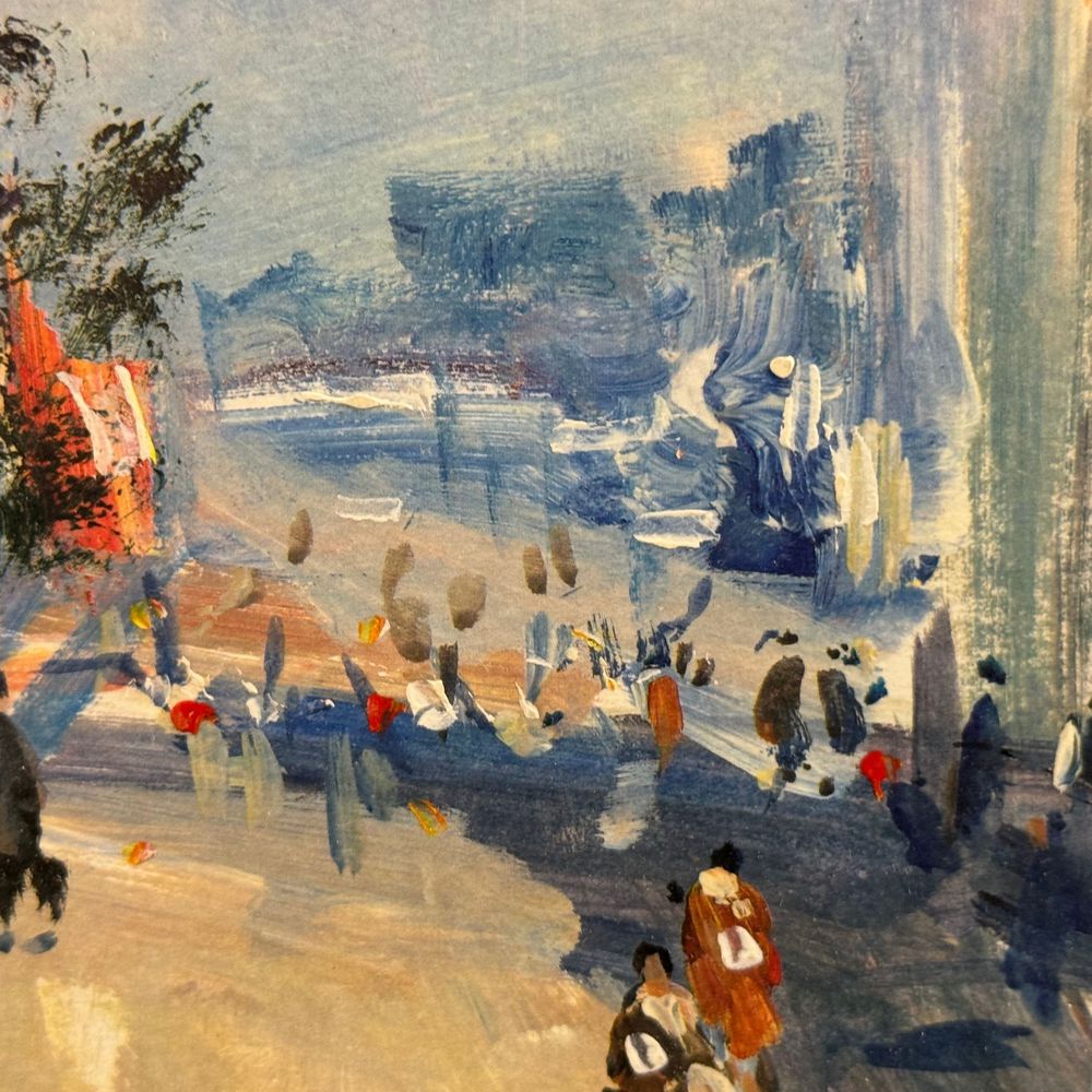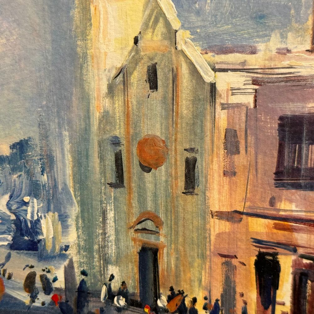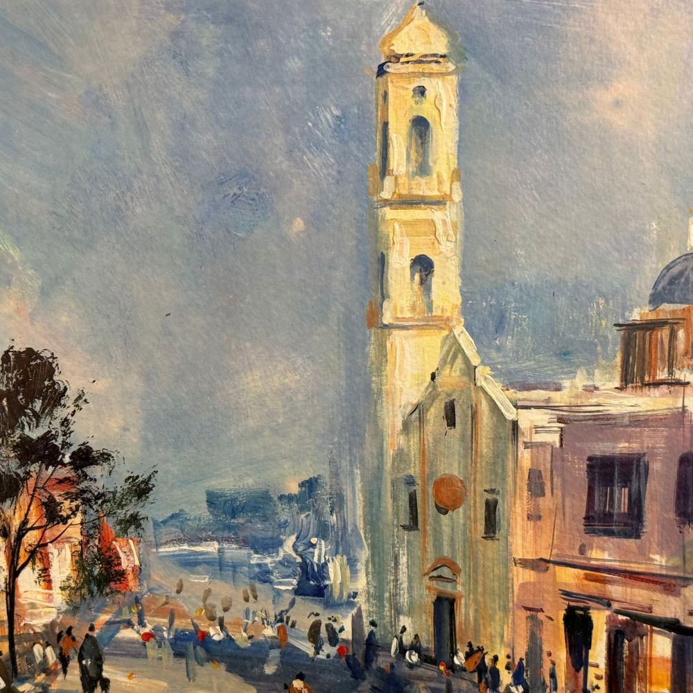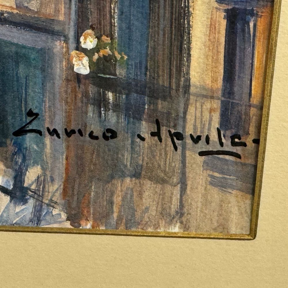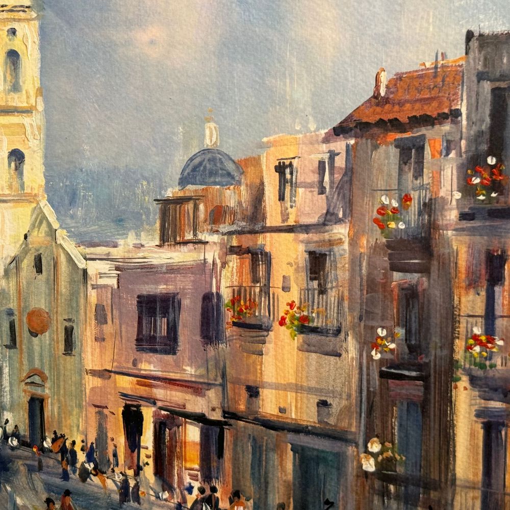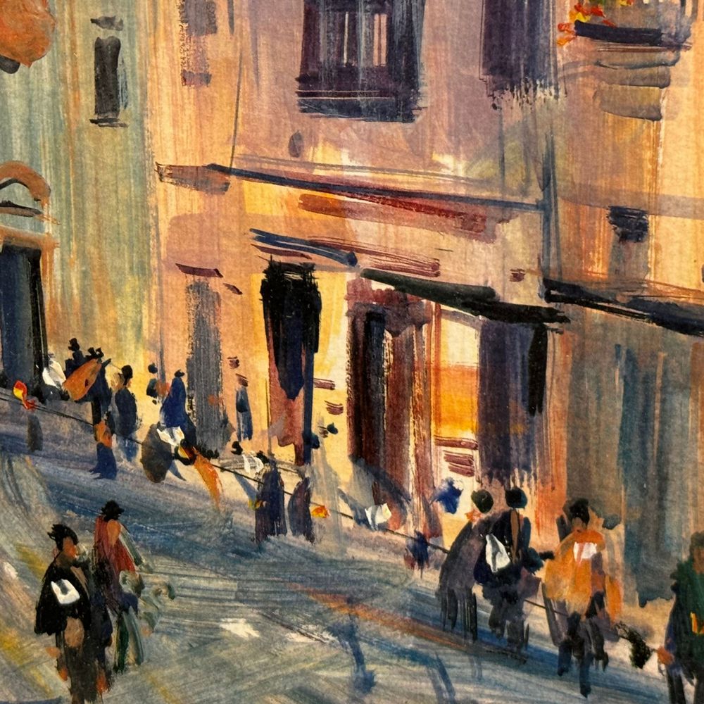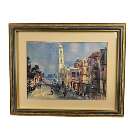 Dipinto acquerello su carta, periodo XX secolo scuola italiana raffigurante Strada con personaggi. Dimensioni interno cornice: 36x26 cm. Dimensioni compreso cornice: 52x42 cm. Firma in basso a destra da Enrico Aprile (1943 - 1998). Opera in buone condizioni.