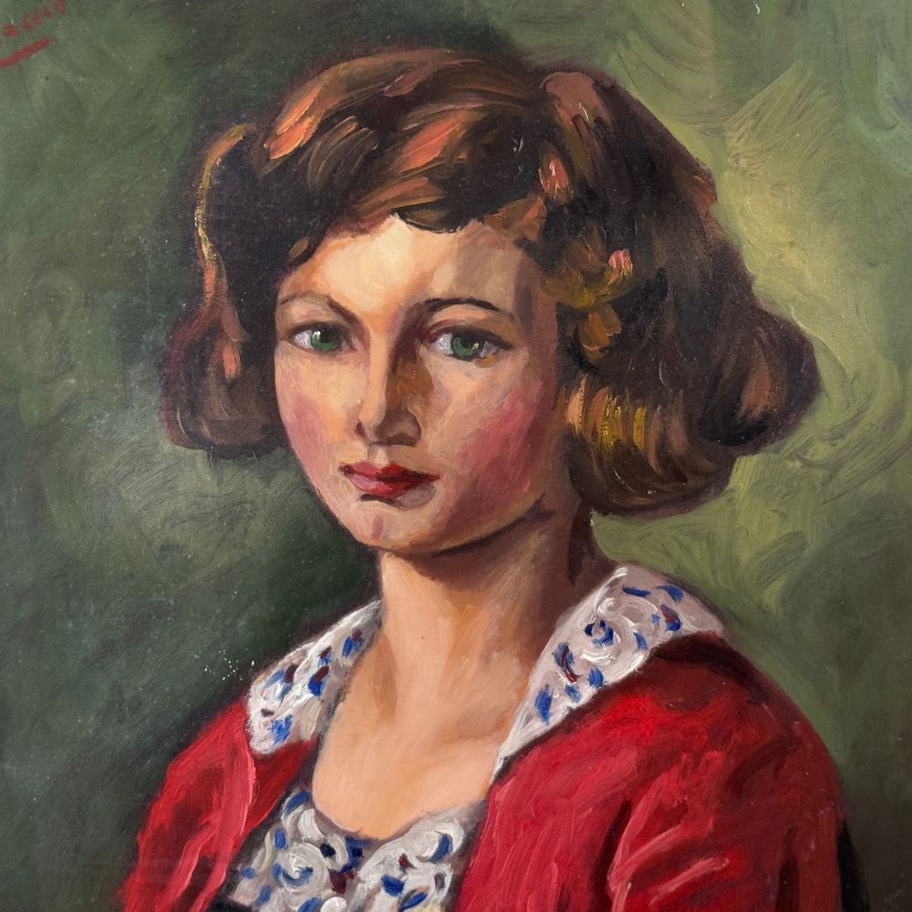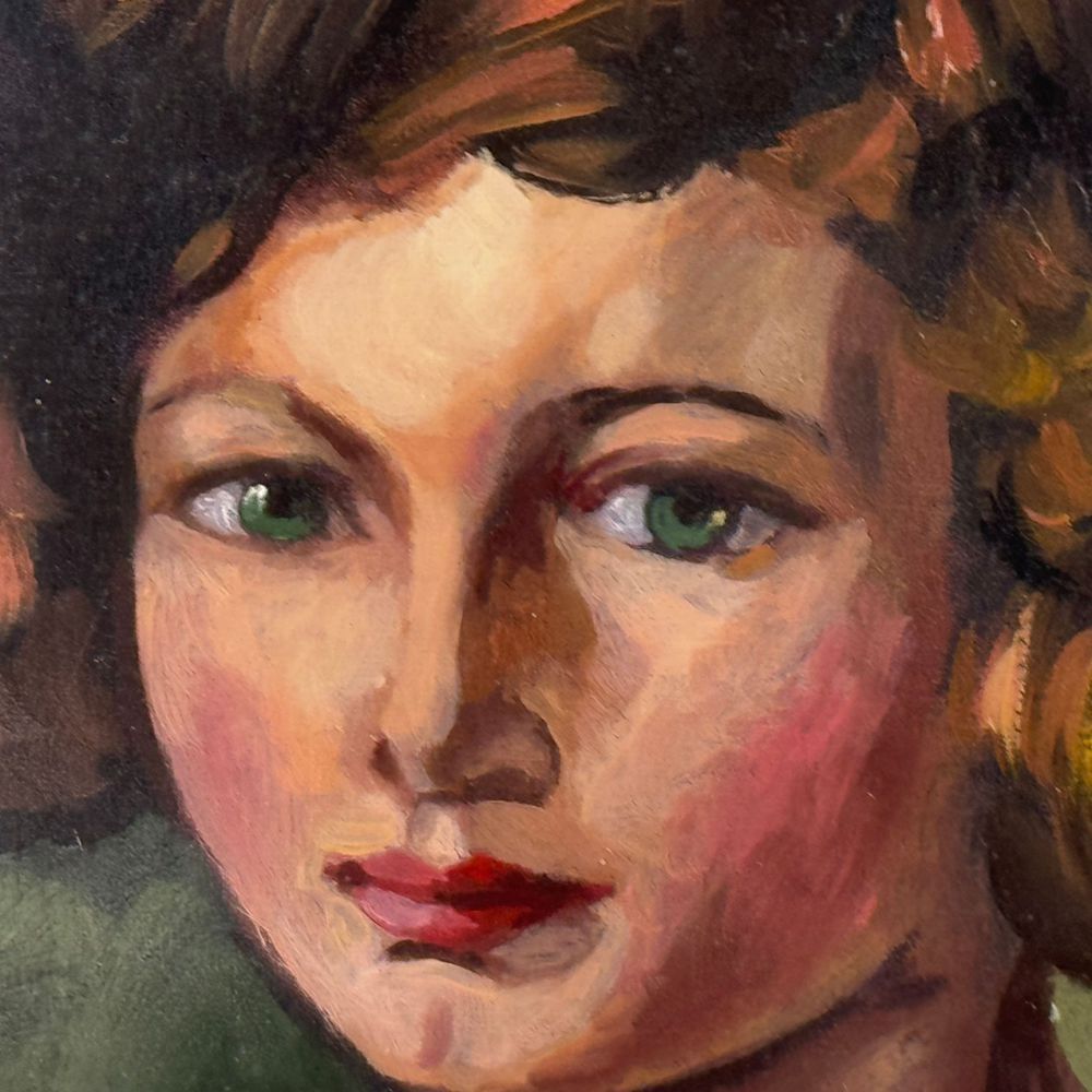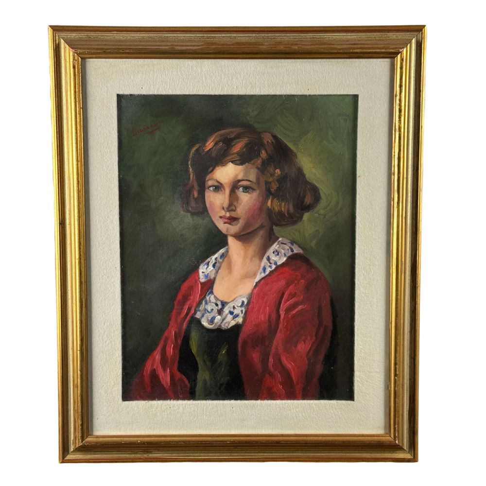 Dipinto olio su tela applicata su cartoncino, periodo XX secolo scuola Italiana, raffigurante Ritratto di donna. Dimensioni interno cornice: 35x45 cm. Dimensioni compreso cornice: 53x63 cm. Reca firma in alto a sinistra da artista non identificato.