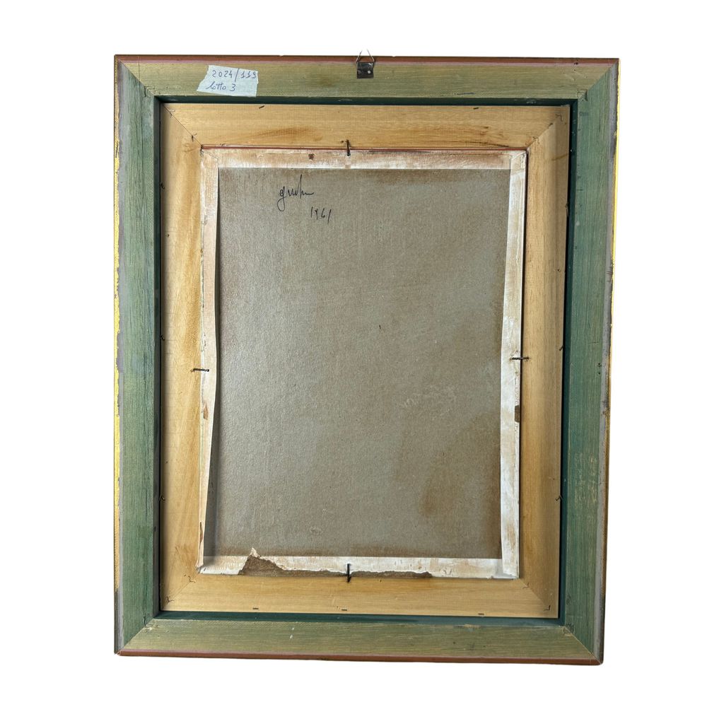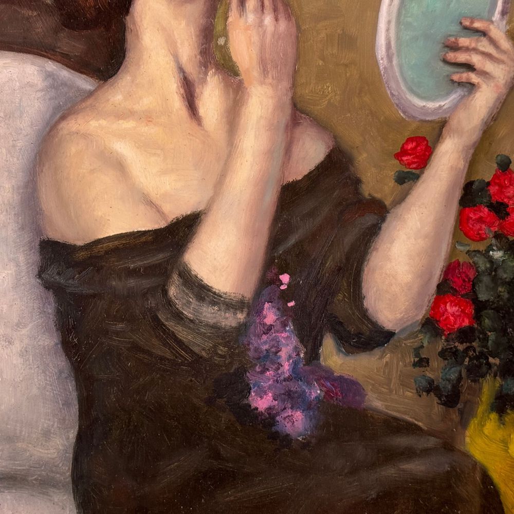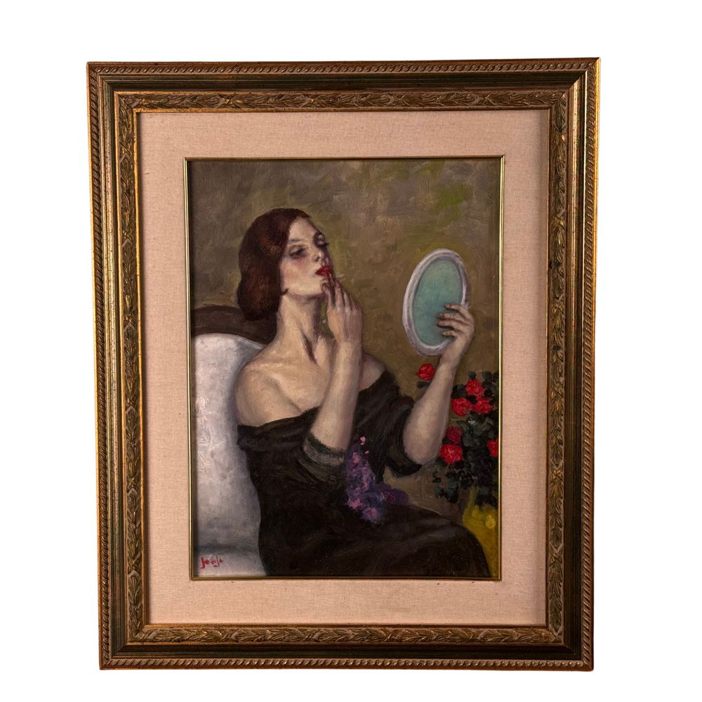 Dipinto olio su tela applicata su cartoncino, periodo XX secolo scuola italiana, raffigurante La vanità. Dimensioni interno cornice: 30x40 cm. Dimensioni compreso cornice: 46x56 cm. Reca firma in basso a sinistra da artista non identificato. Opera in buone condizioni.