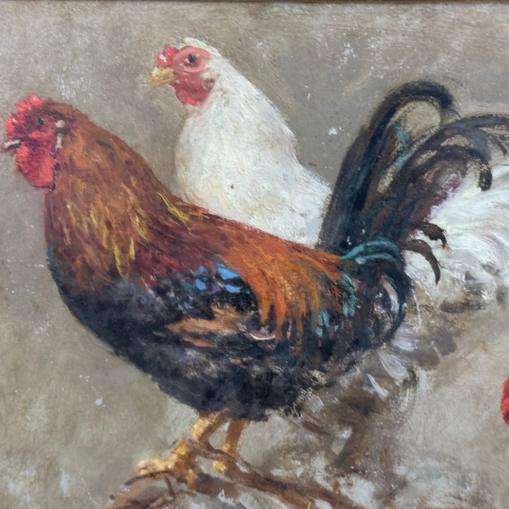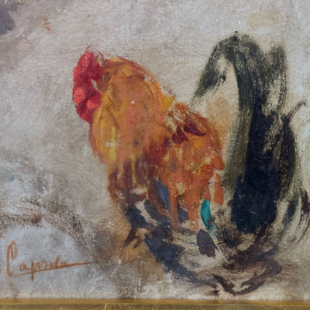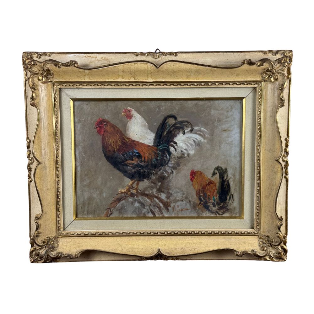 Dipinto olio su cartoncino, periodo XIX secolo scuola Italiana, raffigurante Galli. Dimensioni interno cornice: 40x30 cm. Dimensioni compreso cornice: 52x42 cm. Reca firma in basso a destra da Vincenzo Caprile. Opera in buone condizioni, Cornice post epoca. Vincenzo Caprile nacque a Napoli nel 1856. Di famiglia benestante, poté dedicarsi allo studio della pittura fin da giovanissimo. Fu allievo di Gabriele Smargiassi e Achille Carrillo all’Istituto di Belle Arti di Napoli, completando la propria formazione con Domenico Morelli. Grazie alla frequentazione di Alceste Campriani e Federico Rossano ebbe modo di avvicinarsi alla Scuola di Resina, sperimentando così la resa dal vero del paesaggio e della natura. Dal 1873 fino alla fine degli anni 20 prese parte alle Promotrici napoletane; di cui fu membro del giurì artistico e del comitato permanente tra il 1890 e il 1894 e vicepresidente nel 1911. Esordì alla Promotrice del’73 con il dipinto A Posillipo. Nel 1874 espose Strada alle paludi, nel 1875 Il crepuscolo d’autunno e l’anno successivo A Torre Annunziata e Ricordo di Torre del Greco. Partecipò a esposizioni nazionali ed internazionali tra quelle di Milano, Melbourne, Venezia, Roma, Berlino etc. Nel 1888 divenne professore onorario dell’Istituto di Belle Arti di Napoli. Nello stesso anno soggiornò a Buenos Aires dove ricevette molte commissioni per ritratti da parte dei più importanti politici cittadini.