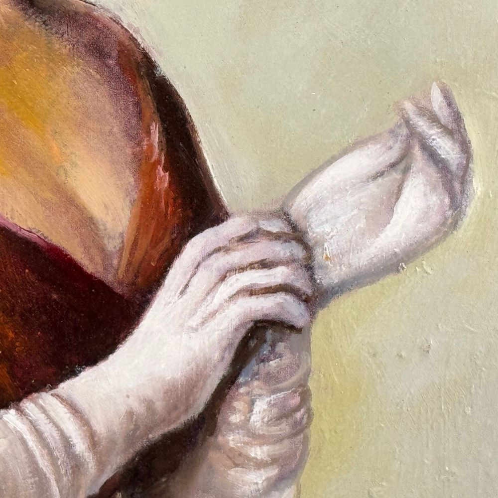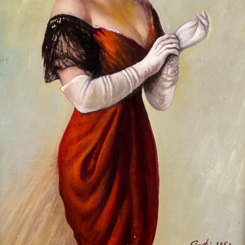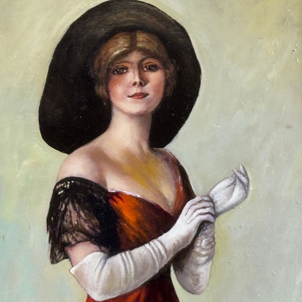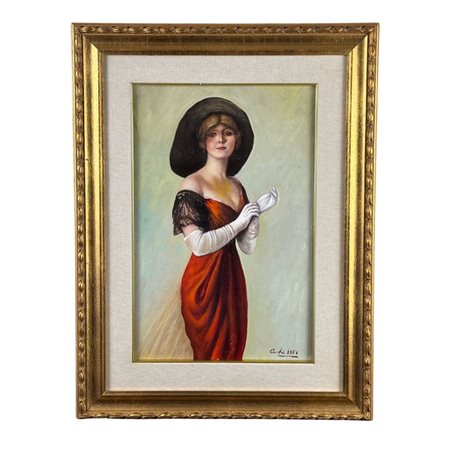 Dipinto olio su tela applicata su pannello, periodo XX secolo scuola Italiana, raffigurante Elegante donna con cappello. Tratto da un'opera di william Haskell Coffin. Dimensioni interno cornice: 30x45 cm. Dimensioni compreso cornice: 47x62 cm. Reca firma in basso a destra da artista non identificato. Opera in buone condizioni.