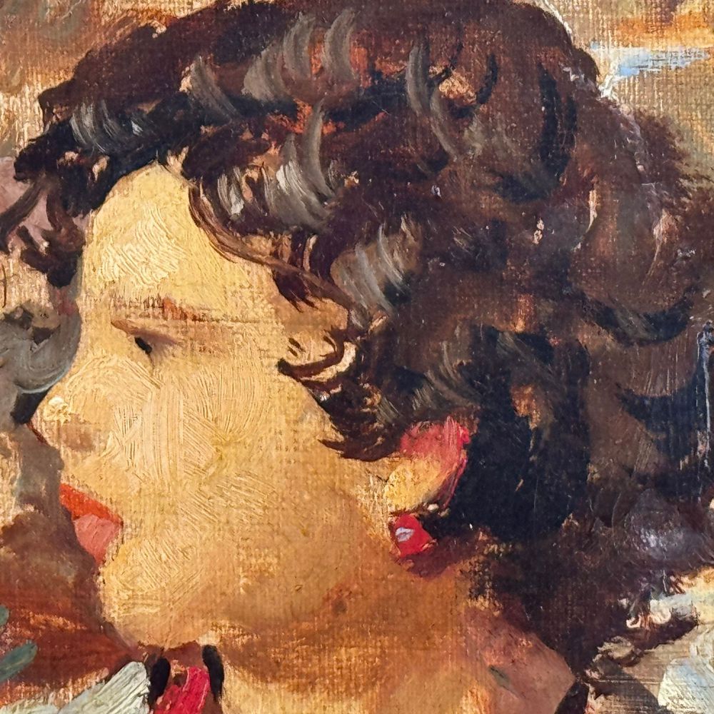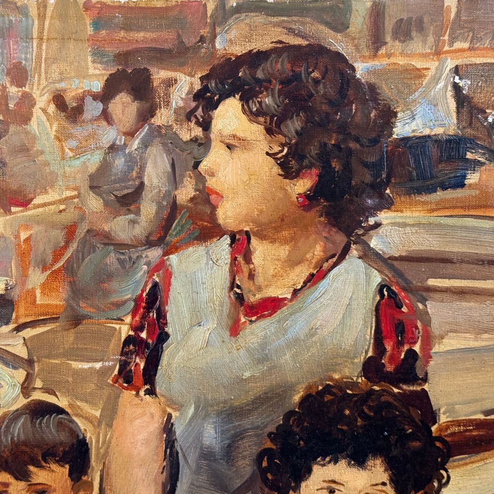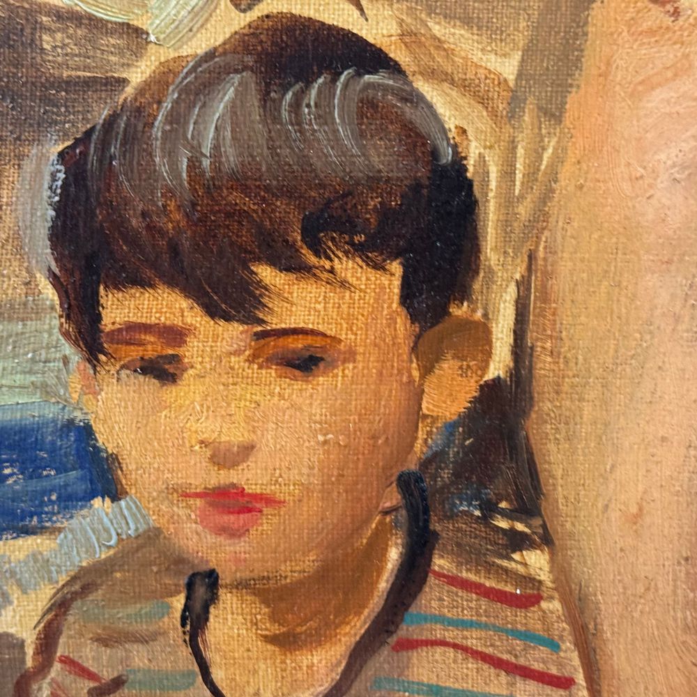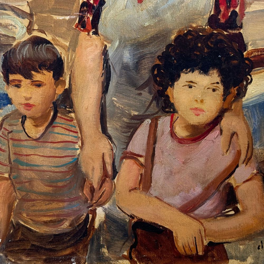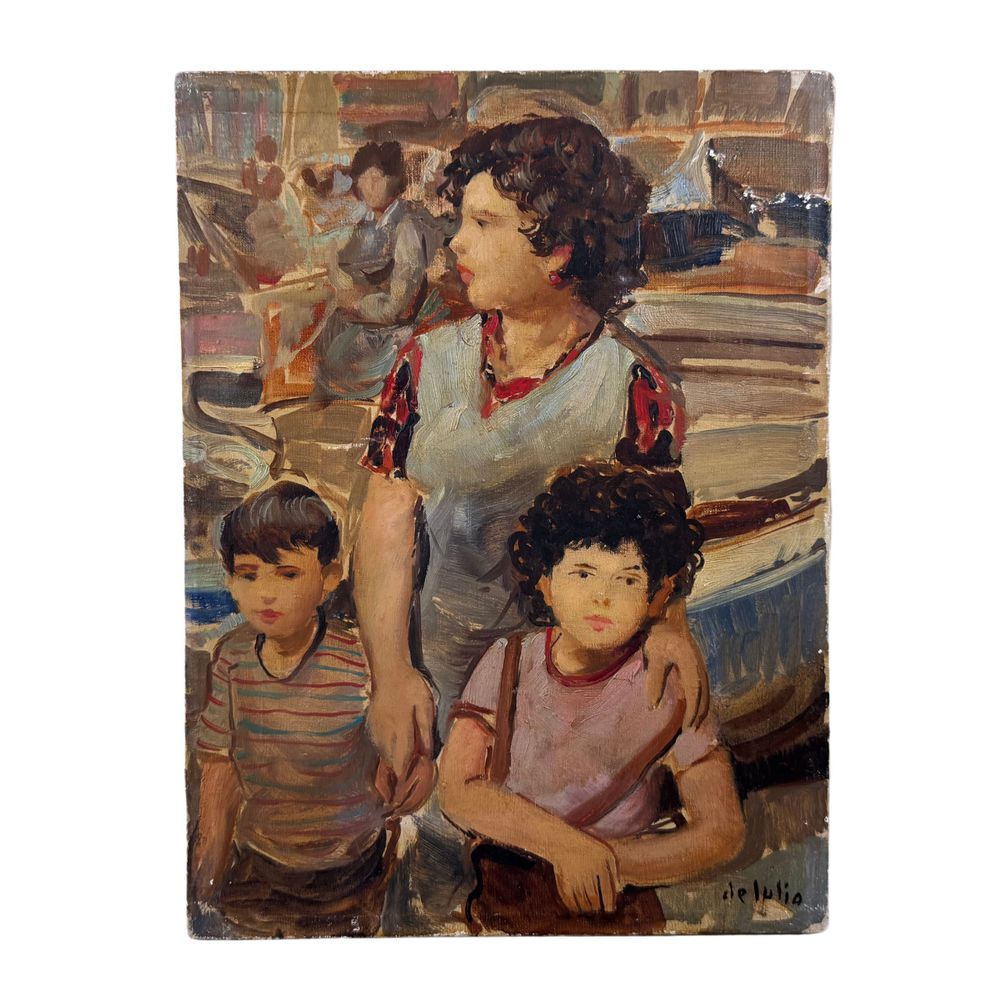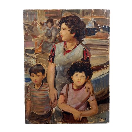 Dipinto olio su tela, periodo XX secolo scuola Italiana, raffigurante Madre e figli. Dimensioni: 30x40 cm. Reca firma in basso a destra da De Julio Roberto (1945). Opera in buone condizioni e di ottima qualità artistica.