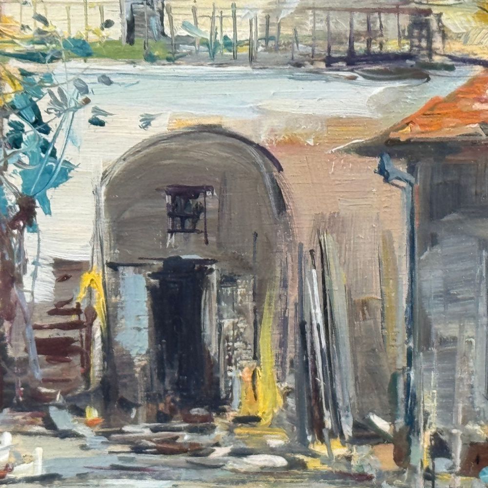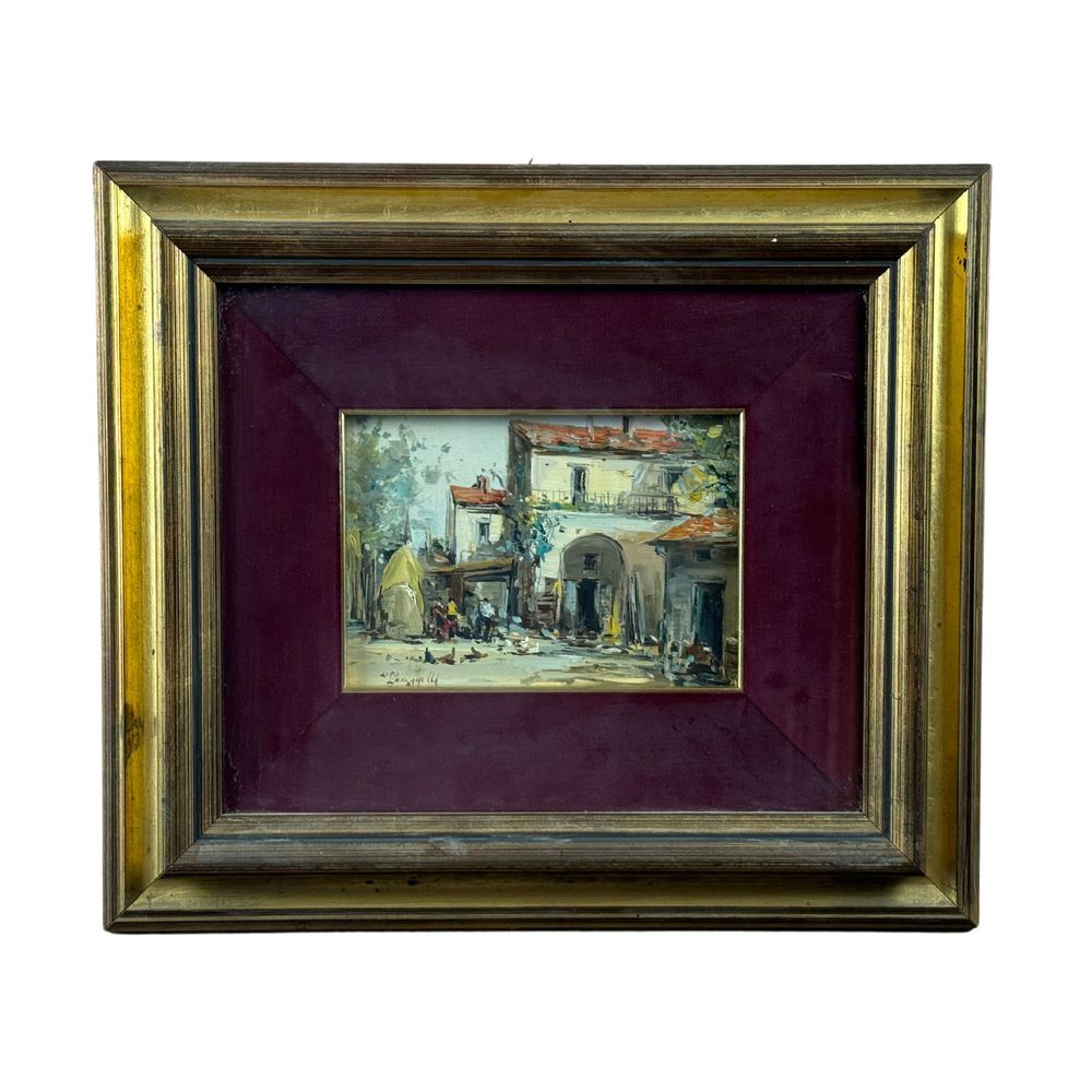 Dipinto olio su tavola, periodo XX secolo scuola Italiana, raffigurante La fattoria. Dimensioni interno cornice: 18x13 cm. Dimensioni compreso cornice: 38x33 cm. Reca firma in basso a sinistra da Ciro Ganzanella. Opera in buone condizioni.