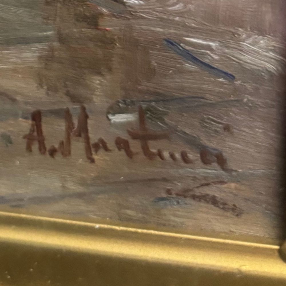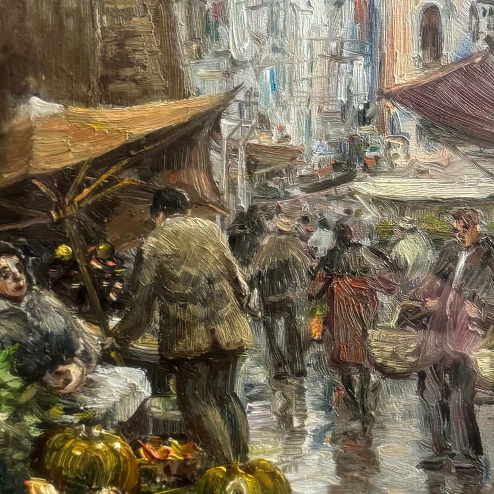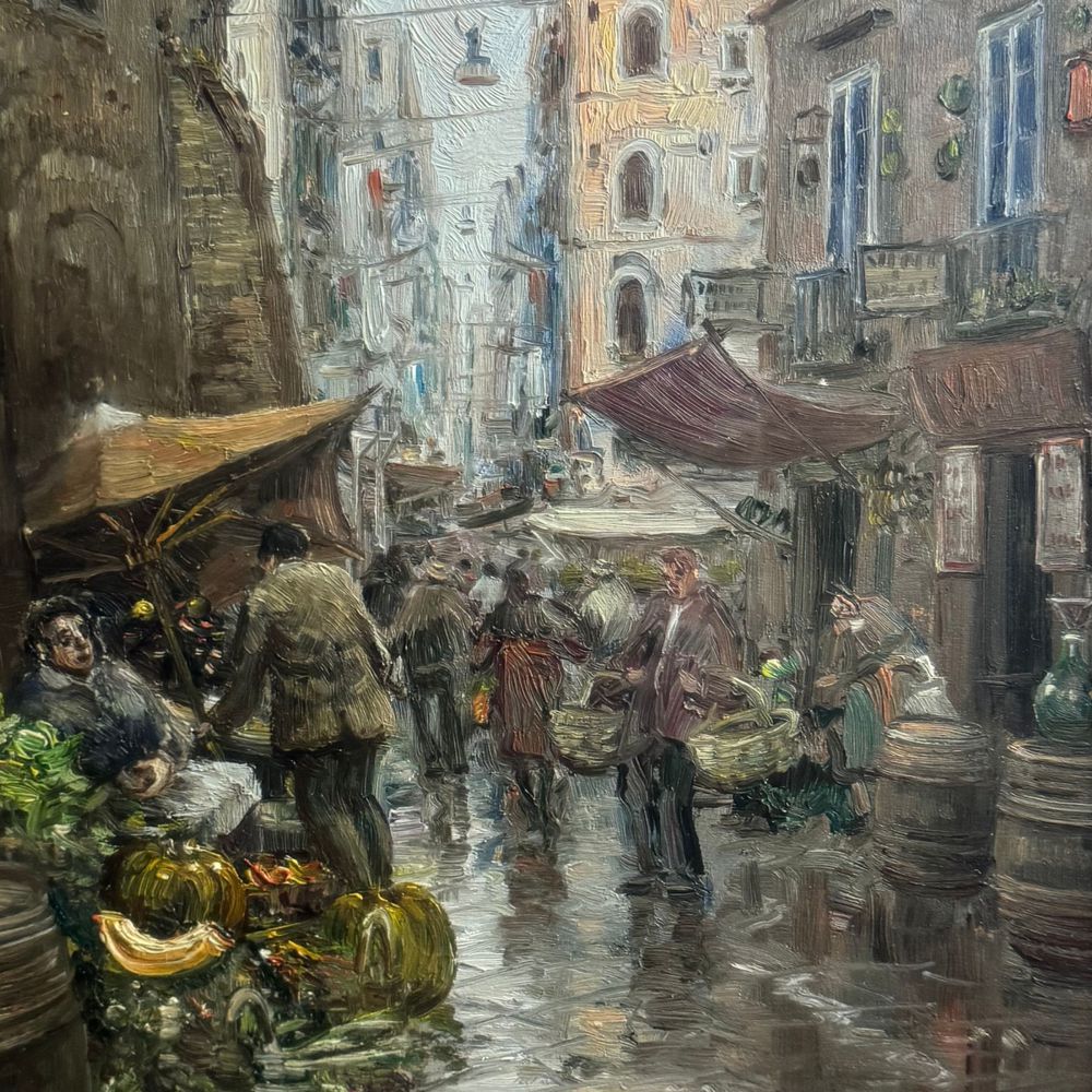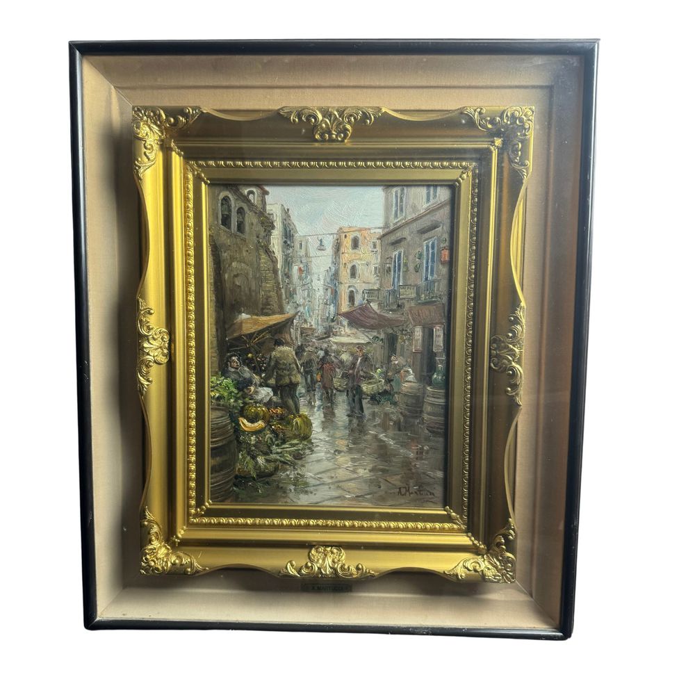 Dipinto olio su tavola, periodo XX secolo scuola Italiana, raffigurante Il mercato di Antignano. Dimensioni interno cornice: 45x35 cm. Reca firma in basso a destra da A. Martucci.