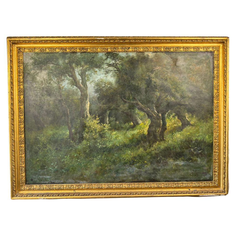 Dipinto olio su tela, periodo XIX secolo scuola Italiana, raffigurante Bosco alberato. Dimensioni interno cornice: 102x72 cm. Reca firma in basso a destra da Francesco Capuano (1854 - 1908).