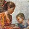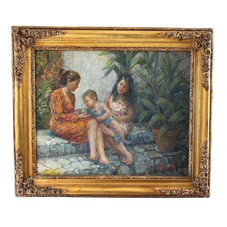 Dipinto olio su pannello, periodo XX secolo scuola italiana, raffigurante Scena con tre personaggi in giardino. Dimensioni interno cornice: 48x40 cm. Reca firma in basso a destra da artista non identificato.