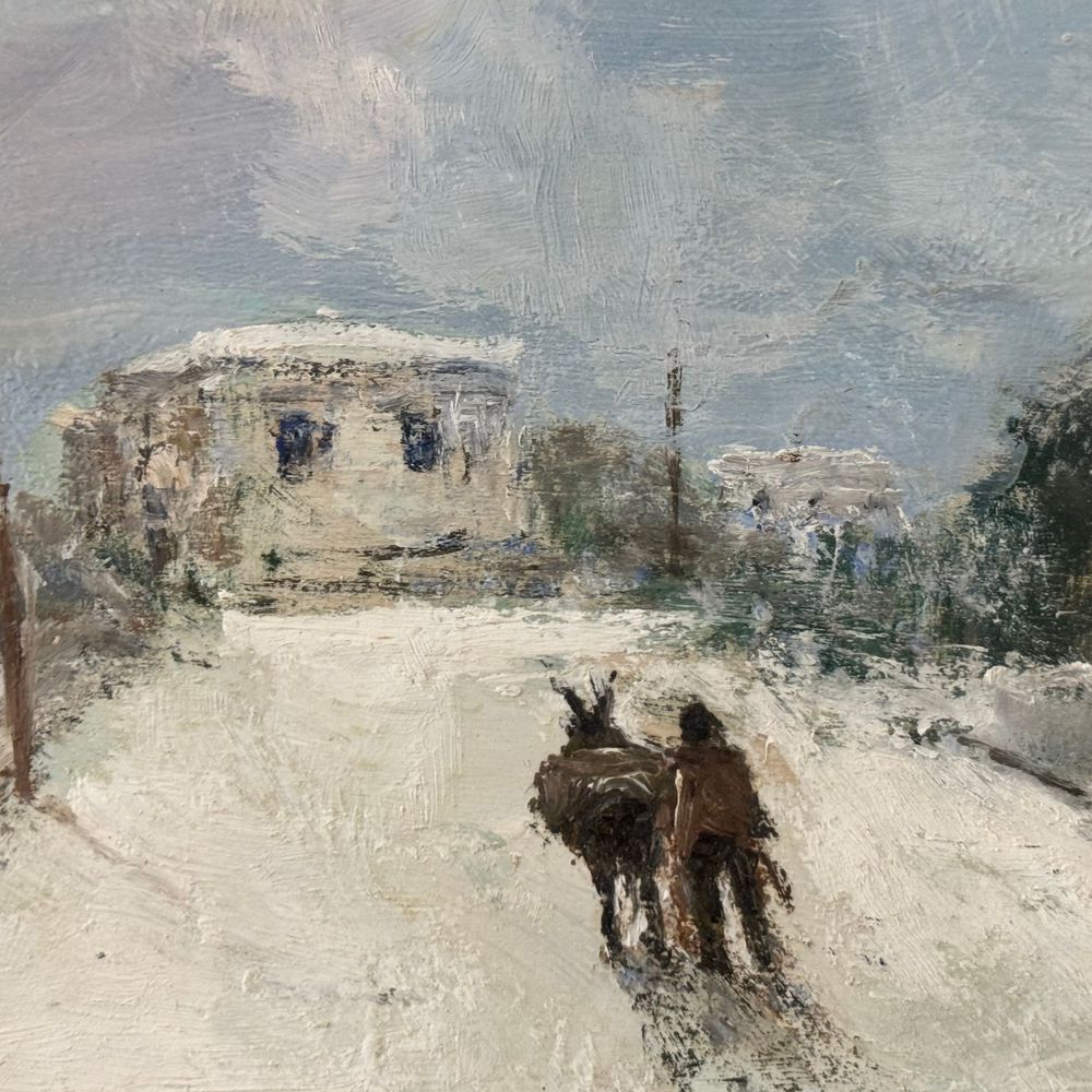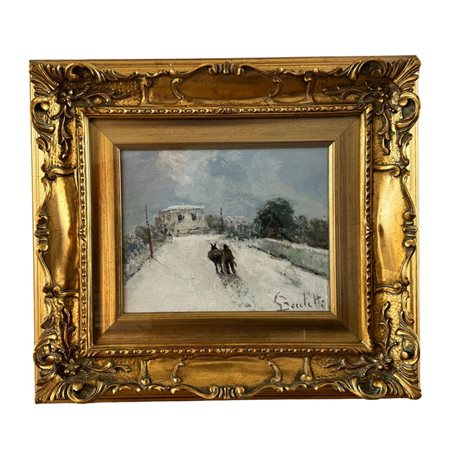 Dipinto olio su tavola, periodo XX secolo scuola italiana, raffigurante Strada di campagna con personaggio e asino. Dimensioni interno cornice: 30x24 cm. Reca firma in basso a destra da Gaetano Bocchetti.