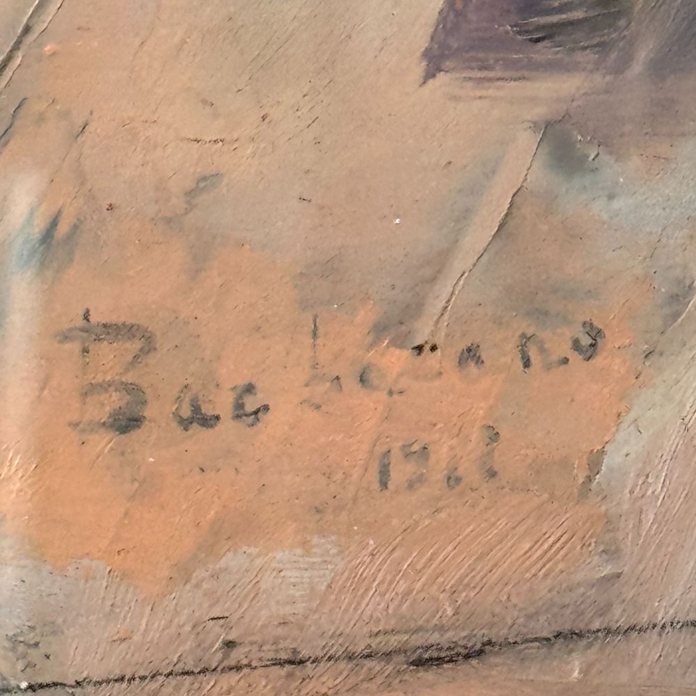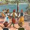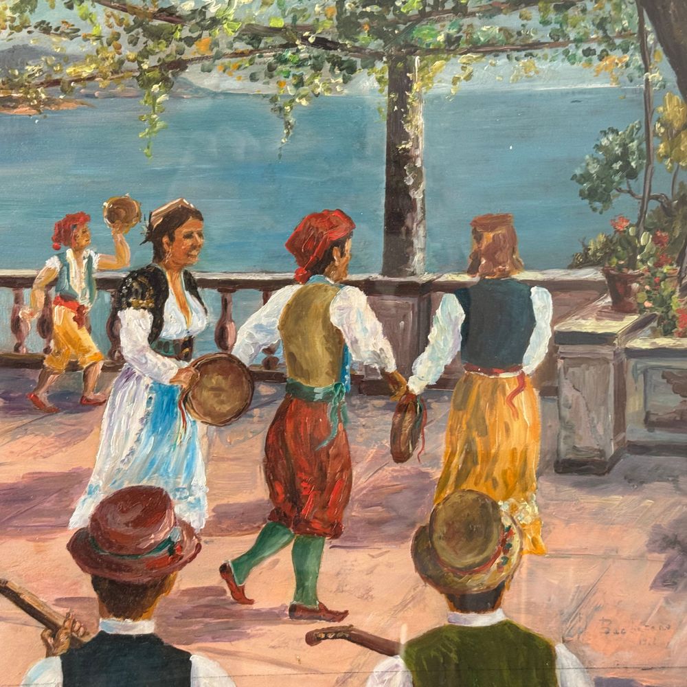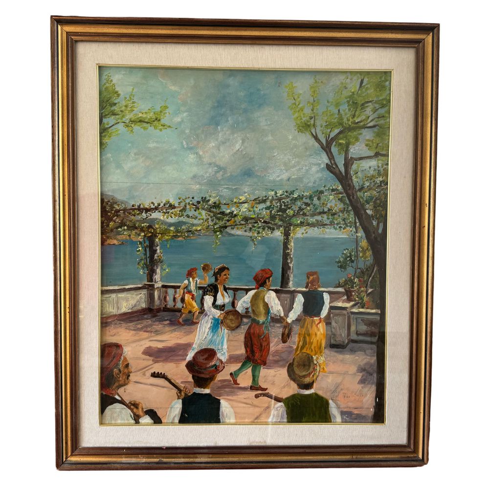 Dipinto olio su tavola, periodo XX secolo, raffigurante Scena di ballo in terrazza sul golfo. Dimensioni interno cornice: 70x57 cm. Reca firma in basso a destra da artista non identificato.