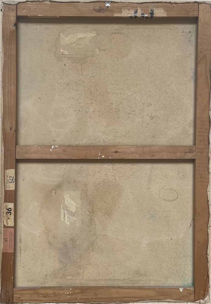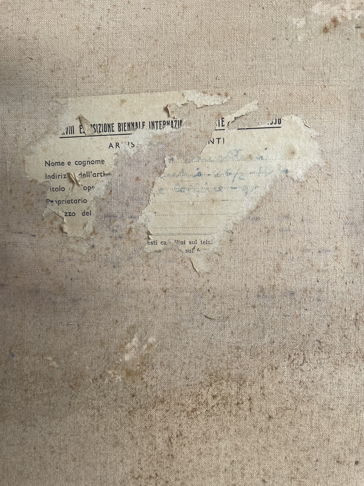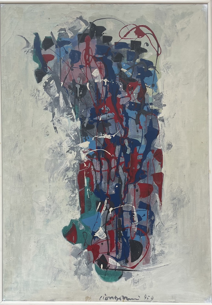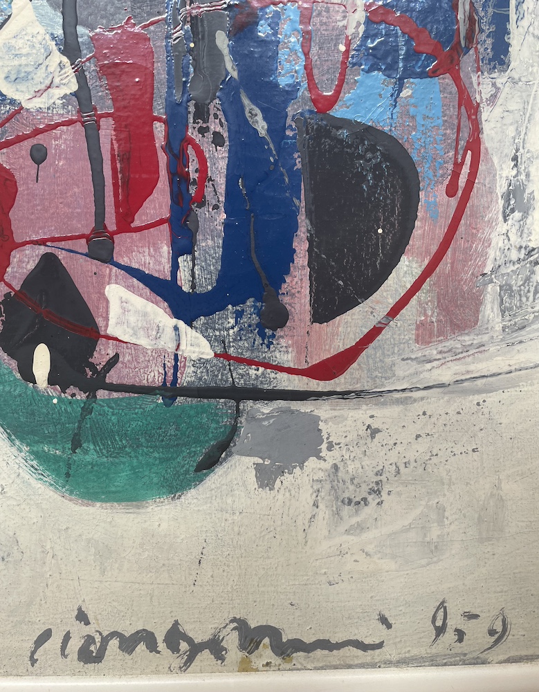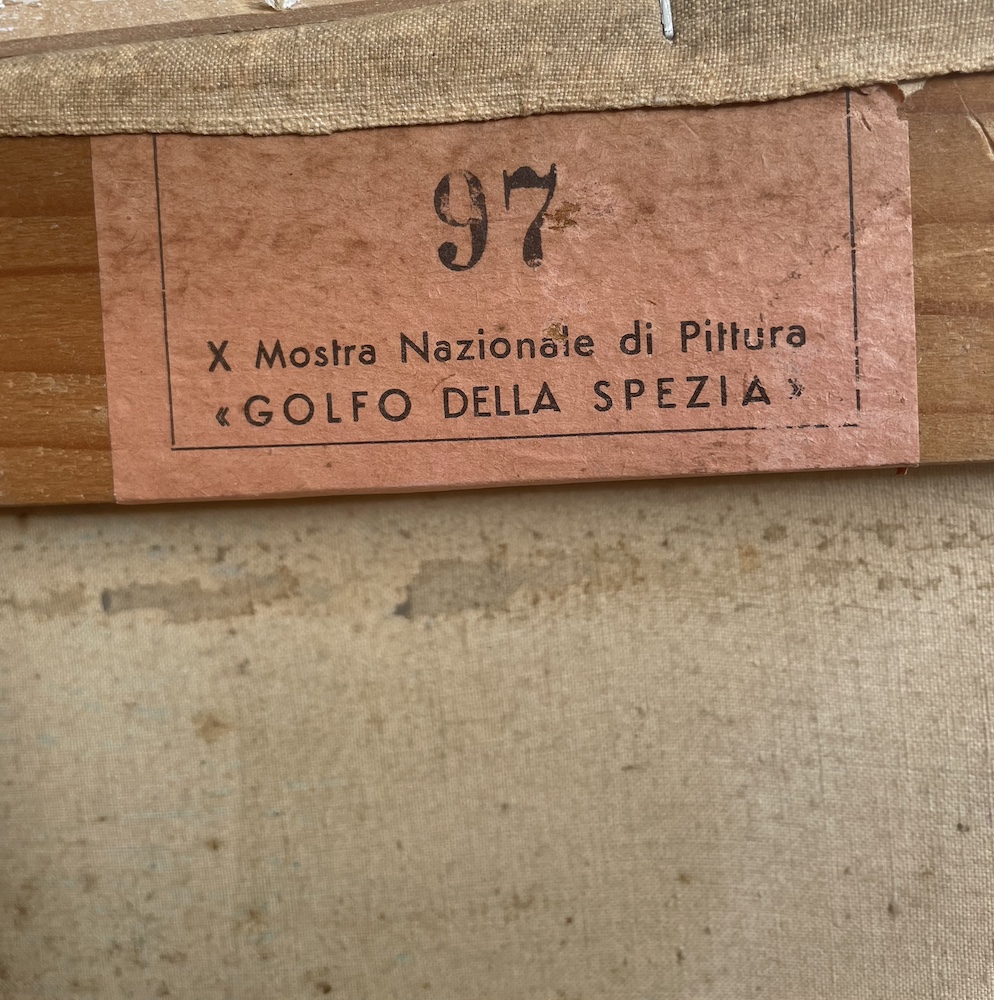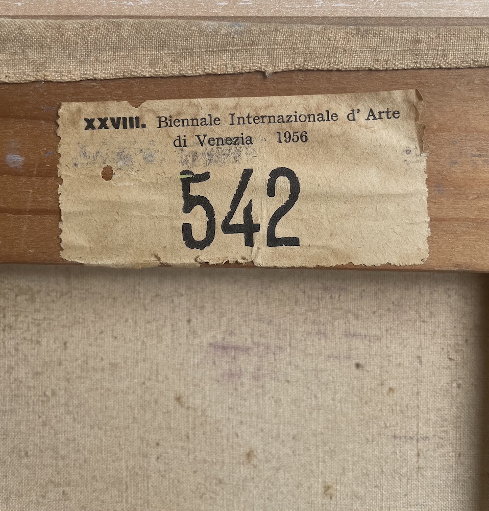 Giovanni Ciangottini (Umbertide 1912 - Bologna 1988). Senza titolo. Tecnica mista su tela. Firmato in basso al centro "Ciangottini". Al verso riporta cartiglio della Biennale Internazionale di Venezia del 1956 e della Mostra Nazionale di Pittura "Golfo della Spezia".