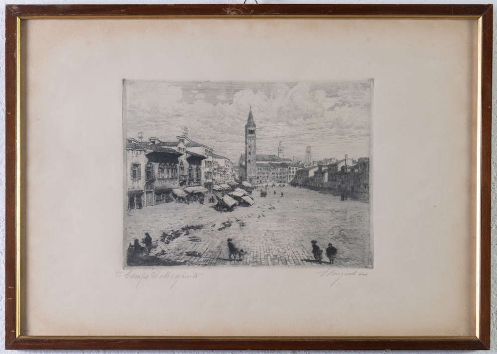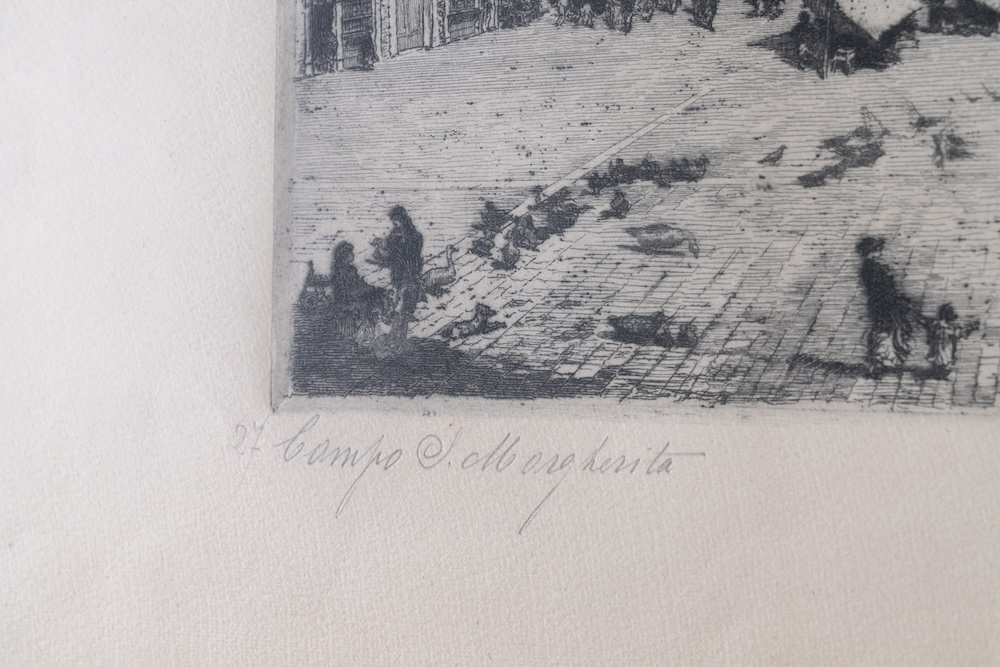 Emanuele Brugnoli (Bologna 1859 - Venezia 1944). Campo S. Margherita, Venezia, 1920 circa. Acquaforte su carta. Titolata a matita in basso a sinistra. Firmata a matita in basso a destra. Lastra cm. 20x27.