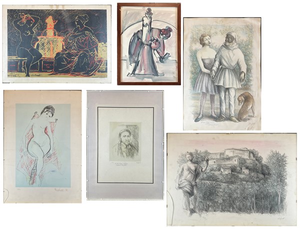 Lotto composto da due litografie e un'acquaforte di Purificato, una litografia di Fiume e una di Raphael Mafai e un acquerello non firmato, di soggetti e misure diverse