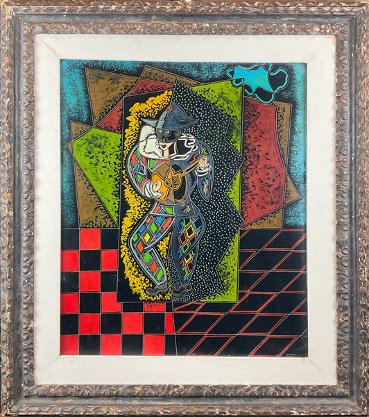 Pippo Oriani "Arlecchino chitarrista" Anni '70 encausto grafito su cartone gessa
