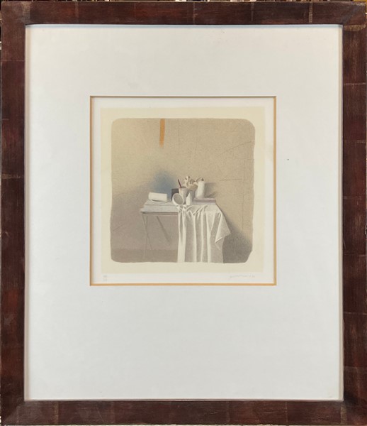 Gianfranco Ferroni "Oggetti sul tavolino e drappo" 1990 litografia a colori fogl
