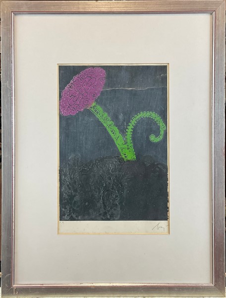Enrico Baj "Ornithogalum Thyrsoides" 1970 acquaforte a colori su carta argentata