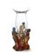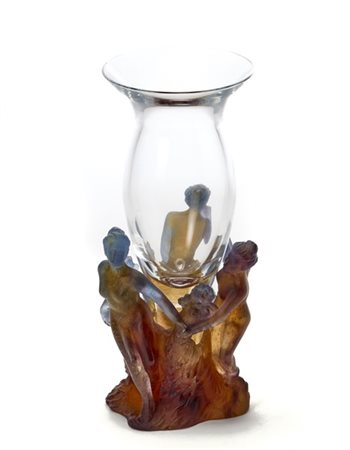 Vaso-scultura in vetro incolore e pasta vitrea ambra e viola decorato con satiro e due nudi femminili