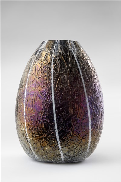 Vaso a sezione schiacciata in vetro soffiato sommerso incolore e ametista scuro con inclusione di canne verticali in vetro lattimo e lavorazione superficiale "ghiacciata" con forte iridazione. Seconda metà secolo XX. (h cm 30)