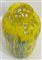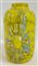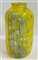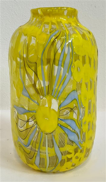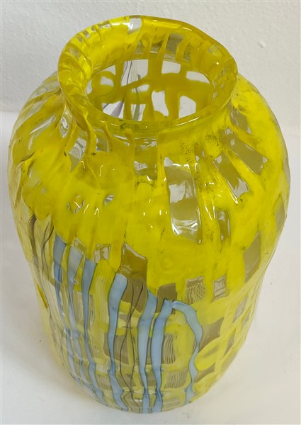 Vaso cilindrico a collo stretto in vetro soffiato a murrine rettangolari in vetro incolore e giallo opaco con applicazioni a caldo di canne in vetro lattimo-azzurro, ametista scuro e avventurina. Seconda metà secolo XX. (h cm 26)
