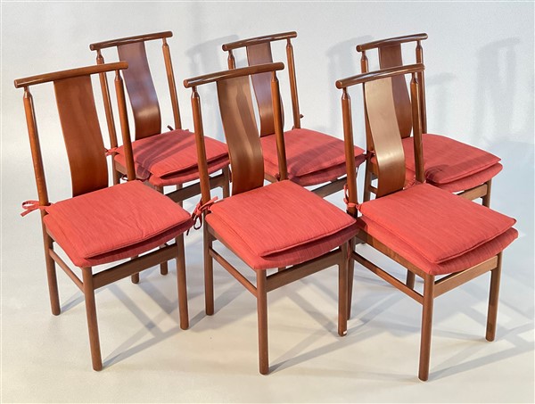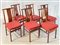 Sei sedie in legno con seduta imbottita e rivestita in tessuto color salmone. C