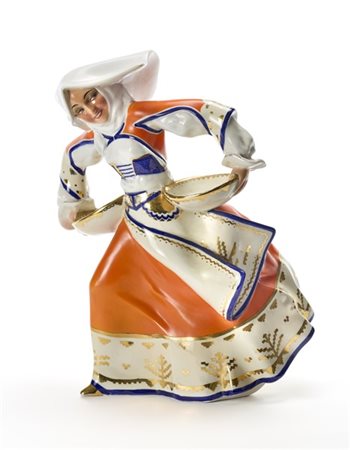 Scultura a tutto tondo. Probabile manifattura Essevi, Torino, anni '30. Ceramica formata a colaggio e smaltata in policromia sotto vetrina e filettata in oro. Iscritta sotto la base in oro: "MADE IN ITALY / GALL: D'ARTE PALLADINO / CAGLIARI / N. 355 - 20/2". (h cm 40,5) (difetti e restauri)