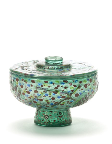 Compostiera in vetro soffiato verde trasparente decorato in pasta vitrea con macchie rosse e blu, con elementi a rilievo incisi all'acido raffiguranti tralci di vite e uva, con decoro geometrizzato a smalto rosso, bianco, nero e oro, e piccole baccellature realizzate alla mola sulla superficie esterna. Nancy, 1900 ca. Firmato a punta "E. Galle nancy" sotto la base. (h cm 11,5; d cm 15) (difetti)