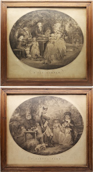 F. D. Soiron (1755-1813), da George Morland "A tea garden; St. James's park" coppia di incisioni inglesi (cm 49x52,5) In cornici (difetti)