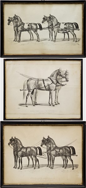 Lemercier & Cie, Brice Thomas, secolo XIX. "Harnais franco-russe pour trotteurs; Harnais de Daumont; Attelace a quatre, grandes guides" tre incisioni francesi a soggetto equestre (cm max 35x53) In cornici (difetti)