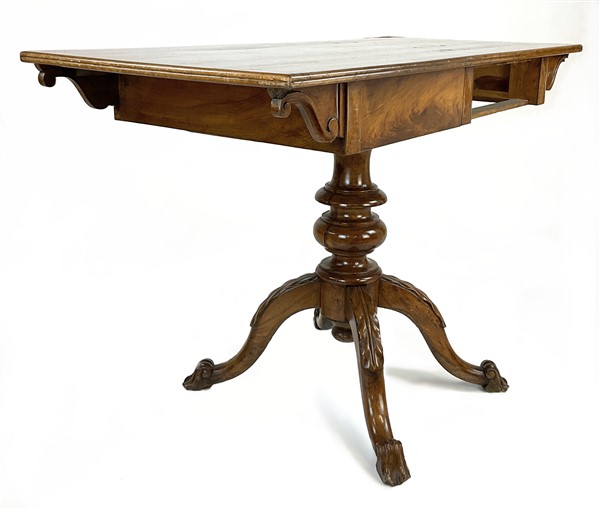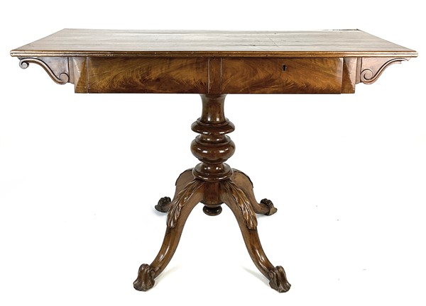 Tavolino da centro in mogano, due cassetti sottopiano, sostegno tornito e quattro gambe mosse (cm 117x78x58) (difetti e rotture al piano)