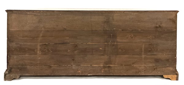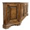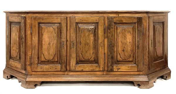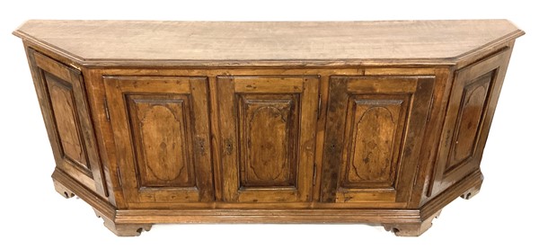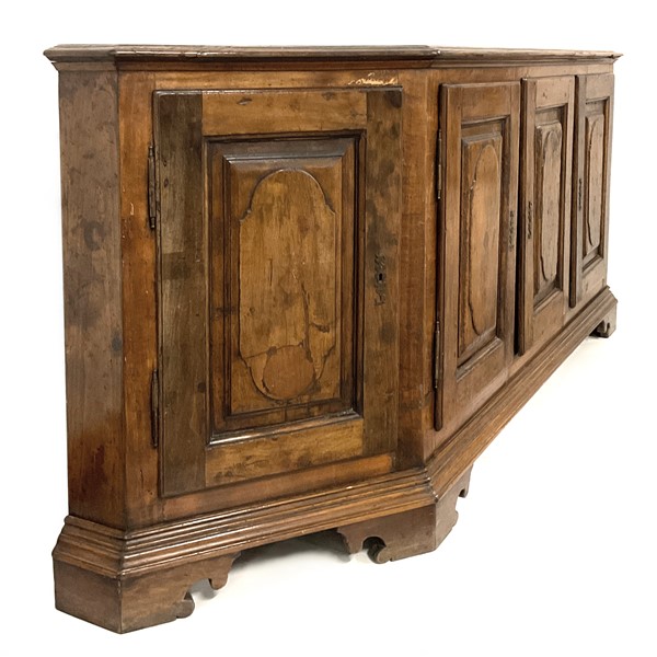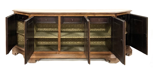 Credenza scantonata in legni vari a cinque ante pannellate con riserve mistilinee, interno con cinque cassetti, piedi a mensola. (cm 253x99x52) (difetti)