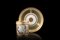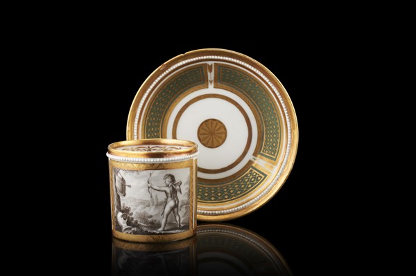 Manifattura francese del secolo XIX. Tazzina da caffè con piattino in porcellana dipinta in policromia nei toni del verde con dorature, perlinature in rilievo lungo i bordi, riserva in grisaille con Cupido in un paesaggio. Ansa sorretta da figura di aquila ad ali spiegate (tazzina: h. cm 6; piatto: d. cm 13) (difetti)